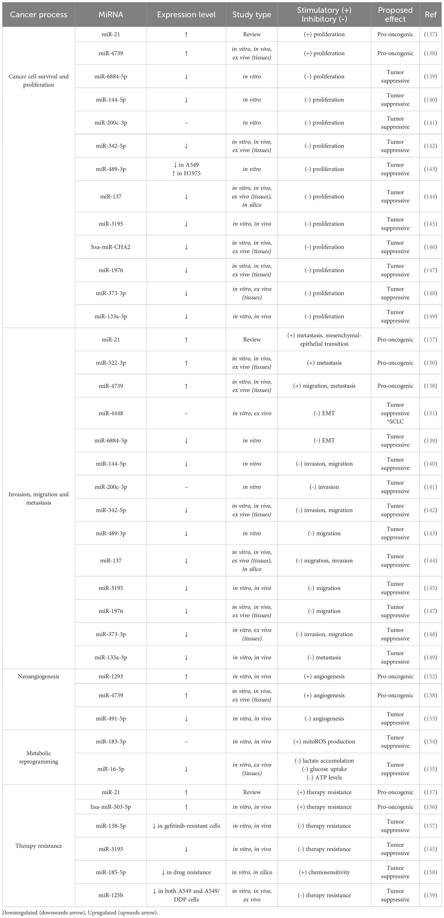 The human genome encompasses coding and non-coding regions, each playing distinct roles in cellular function (7). Coding regions, which make up about 2% of the genome, are responsible for producing proteins that perform various cellular functions. In contrast, non-coding regions, which constitute a large part of the genome, do not code for proteins. Instead, they are crucial in regulating gene expression and maintaining genomic stability (8). The interplay between the coding and non-coding regions is increasingly recognized as a fundamental aspect in the development and progression of various cancers, including lung cancer (9). Both the coding and non-coding genome are largely implicated in the carcinogenesis and progression processes of lung cancer. Specific genetic alterations in driver genes are the mainstay of targeted therapeutics in lung cancer, including subtypes such as LUAD. Some of the most well-known oncogenes and tumor suppressor genes associated with lung cancer include EGFR, KRAS, and TP53 (10). These genetic alterations of the coding genome are pivotal in the initiation and progression of lung cancer, making them primary targets for therapeutic interventions. By comparison, the non-coding genome encompasses various elements, including promoters, enhancers, microRNAs (miRNAs), and long non-coding RNAs (lncRNAs), which interact with coding regions to influence cancer development and progression. Non-coding RNAs can modulate the epithelial-to-mesenchymal transition (EMT)/invasion, angiogenesis, and other progression processes (11). The functions and mechanisms of action are variable between different classes of ncRNAs, as is their biogenesis (12). MiRNAs are small non-coding RNAs of various lengths (approximately 22 nucleotides) generated via primary miRNAs (pri-miRNA), derived from introns or other non-coding transcripts (13). Their discovery by the Victor Ambros’ group (14) and Gary Ruvkun’s group (15, 16) revolutionized the field of non-coding RNAs. The main function of miRNAs includes mRNA degradation or translational repression via binding the 3’-UTR of a target mRNA through the miRNA-induced silencing complex (miRISC) (17). Other mechanisms of action include binding to coding regions and thus inhibiting protein expression, or binding to the 5’-UTR of mRNAs (12). Alternatively, miRNAs can also directly upregulate expression (18).