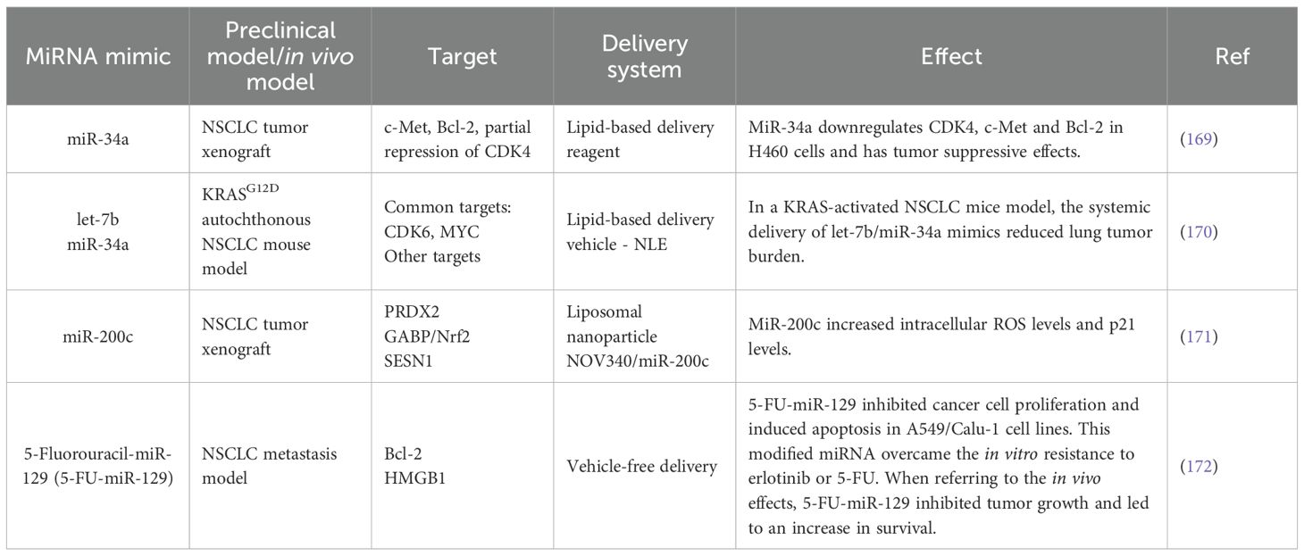 When considering miRNAs in a therapeutic context, the agents can act either as miRNA mimics or miRNA inhibitors. Table 4 presents a selection of NSCLC preclinical studies that focus on miRNA mimics.