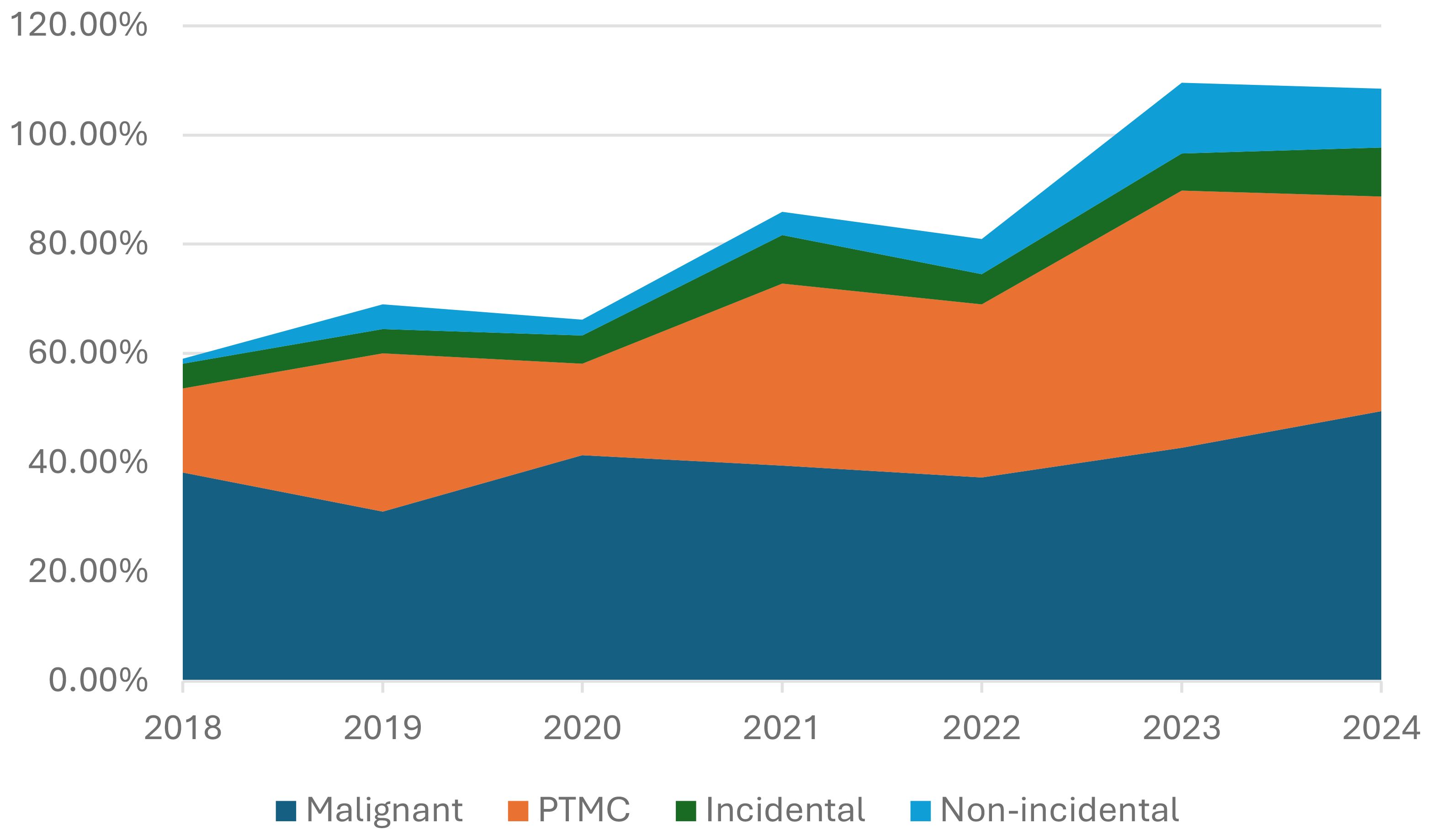 The trend in PTMC diagnosis and its incidental and non-incidental subgroups was assessed over the years as a proportion of the total number of malignant cases and compared accordingly (Figure 1).