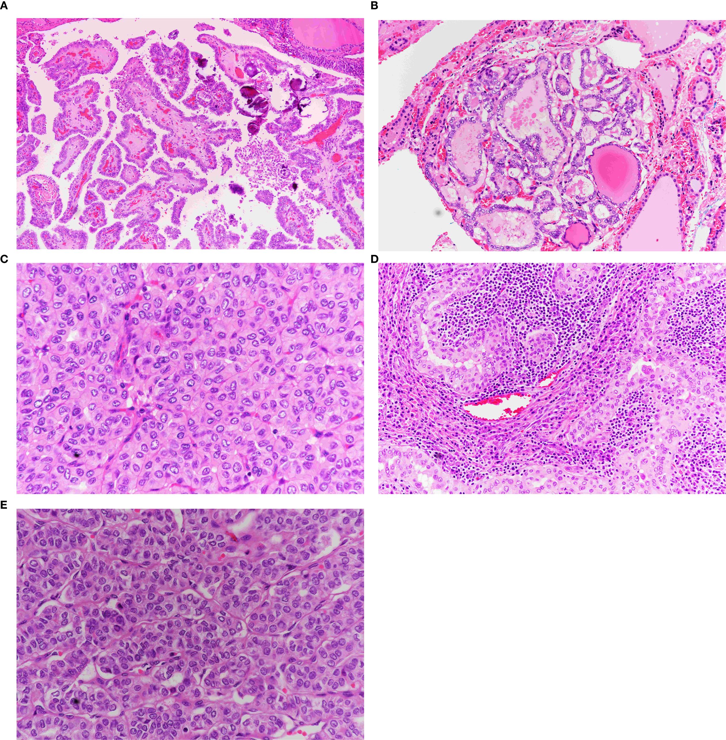 Figure 2. Morphological subtypes of PTMC. (A) Classic papillary thyroid microcarcinoma. Note the papillae with broad fibrovascular cores covered by follicular cells exhibiting diffuse papillary nuclear features (×40). (B) Follicular variant of PTMC. Exclusively follicular growth pattern with characteristic papillary nuclear features (×40). (C) Oncocytic PTMC. Solid and trabecular growth pattern composed entirely of oncocytic cells with papillary nuclear features (×40). (D) Warthin-like PTMC. Papillary oncocytic growth within a lymphoplasmacytic background (×40). (E) Solid variant of PTMC. Solid, follicular, and trabecular growth patterns with papillary nuclear features (×40).