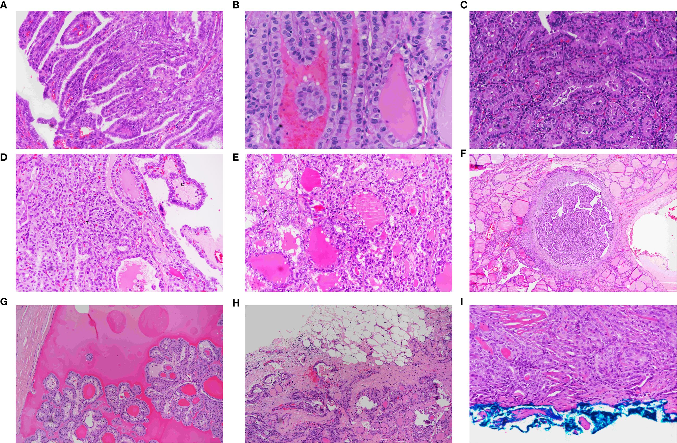 Figure 3. Morphological features of papillary thyroid carcinoma, tall cell subtype. (A) TCS showing tall, slender papillae arranged in parallel, creating a tram-track appearance (×40). (B) Tram-track appearance in TCS (×40). (C) TCS composed of tall eosinophilic cells with height 2–3 times their width, distinct cytoplasmic borders, and basal, non-stratified nuclei (×40). (D) Mixed TCS (T) and classic (C) PTMC (×40). (E) Mixed follicular (F) and TCS (T) papillary microcarcinoma (×40). (F) Fully encapsulated TCS showing tram-track appearance at low power (×20). (G) Cystic TCS with papillary tumor fragments floating in a cystic space (×40). (H) Infiltrative growth pattern characteristic of TCS (×20). (I) TCS involving the inked surgical margin (×40).