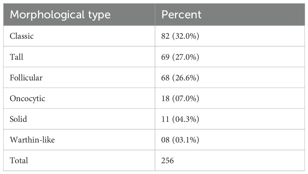 A total of 256 PTMC tumor foci were identified in 168 cases. The morphological subtypes and frequencies are presented in Table 2. Regardless of the subgroup, the classical subtype was the most common (32%), followed by the tall cell (27.0%) and follicular (26.6%) subtypes. These three subtypes account for 85.6% of all PTMC tumors. The minor subtypes included oncocytic, solid, and Warthin-like subtypes (Figure 2). The diffuse sclerosing and columnar subtypes were not observed in this study.