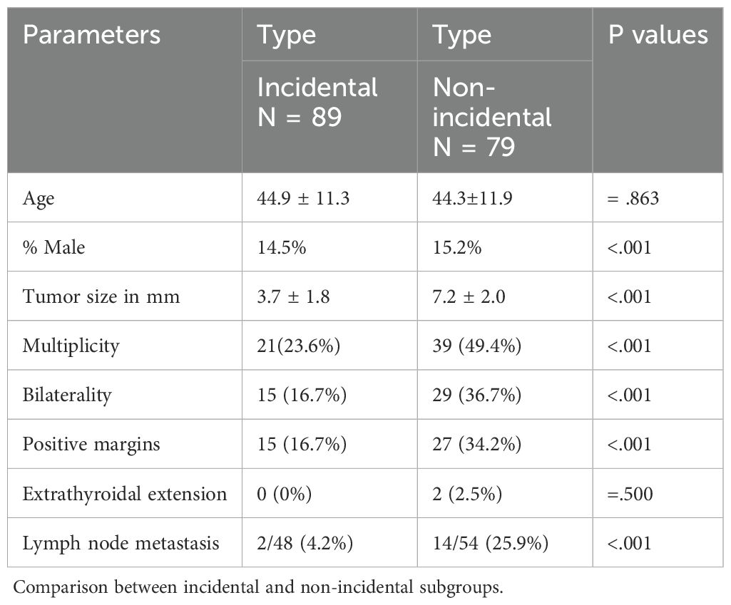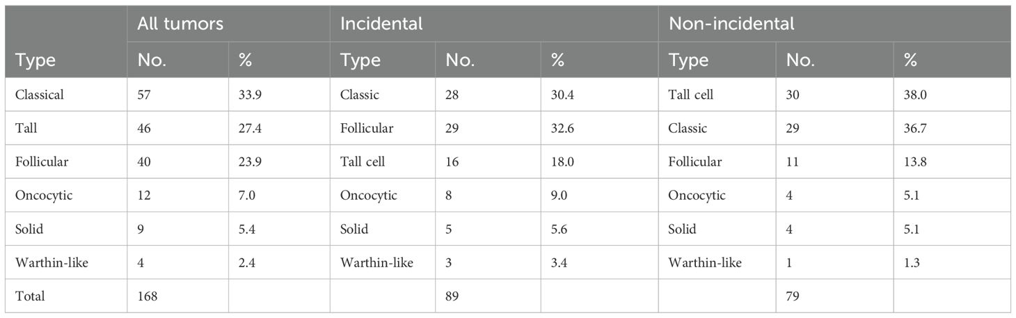 Eighty-nine cases (53%) were classified as incidental and identified during histopathological examination of thyroids removed for benign conditions, with no preoperative suspicion of malignancy. The remaining 79 cases (47%) were categorized as non-incidental, all of which had undergone radiological, cytological, or both types of preoperative testing that were suspicious for malignancy.
