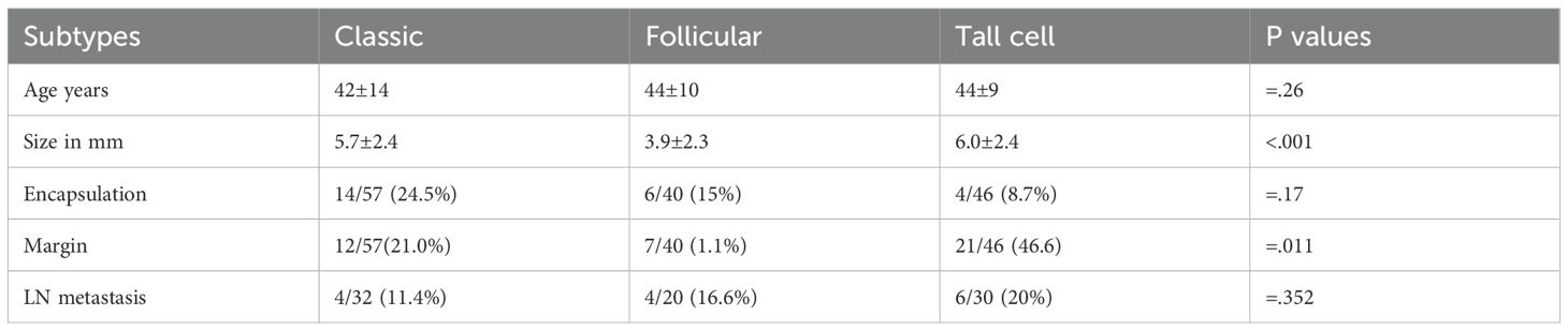 A morphological and epidemiological account of the tall cell subtype (TCS) was provided. The risk factors for aggression, size, lymph node status, and margin status at diagnosis were compared with those of the more common subtypes, namely the classic and follicular subtypes (Table 5).