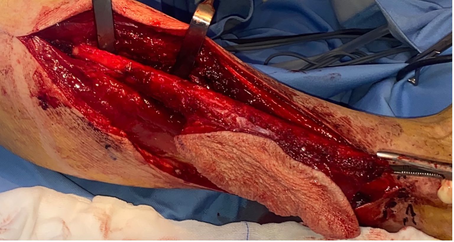 Figure 2. Right osteocutaneous fibula flap harvesting, with cutaneous paddle supplied by two perforating vessels, utilized for intraoral soft tissue reconstruction. The use of the contralateral fibula allows for a longer pedicle length by enabling its posterior exit, thereby reducing the cervical trajectory required to reach the donor vessels.