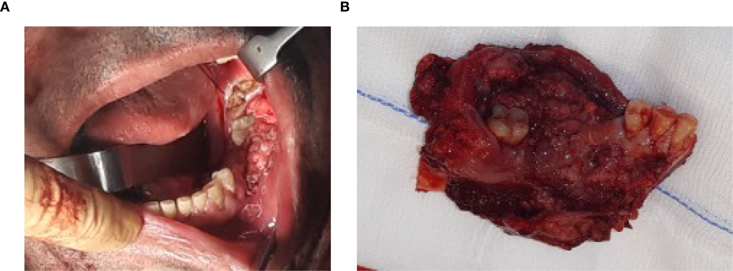 (A) Oral squamous cell carcinoma involving the left mandibular gingiva and bone, extending from the retromolar trigone region posteriorly to tooth 3.4 anteriorly. (B) Hemimandibulectomy showing the resected neoplasm, with the mandibular bone of the third quadrant, associated dental elements 3.2, 3.3, 3.4, and 3.8, and surrounding soft tissues.