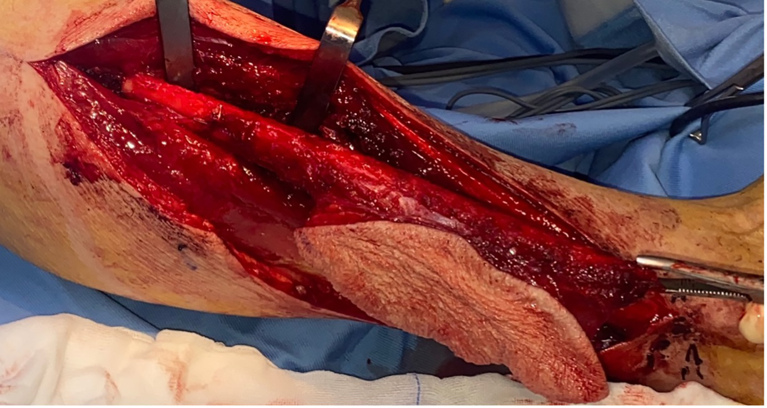 Right osteocutaneous fibula flap harvesting, with cutaneous paddle supplied by two perforating vessels, utilized for intraoral soft tissue reconstruction. The use of the contralateral fibula allows for a longer pedicle length by enabling its posterior exit, thereby reducing the cervical trajectory required to reach the donor vessels.