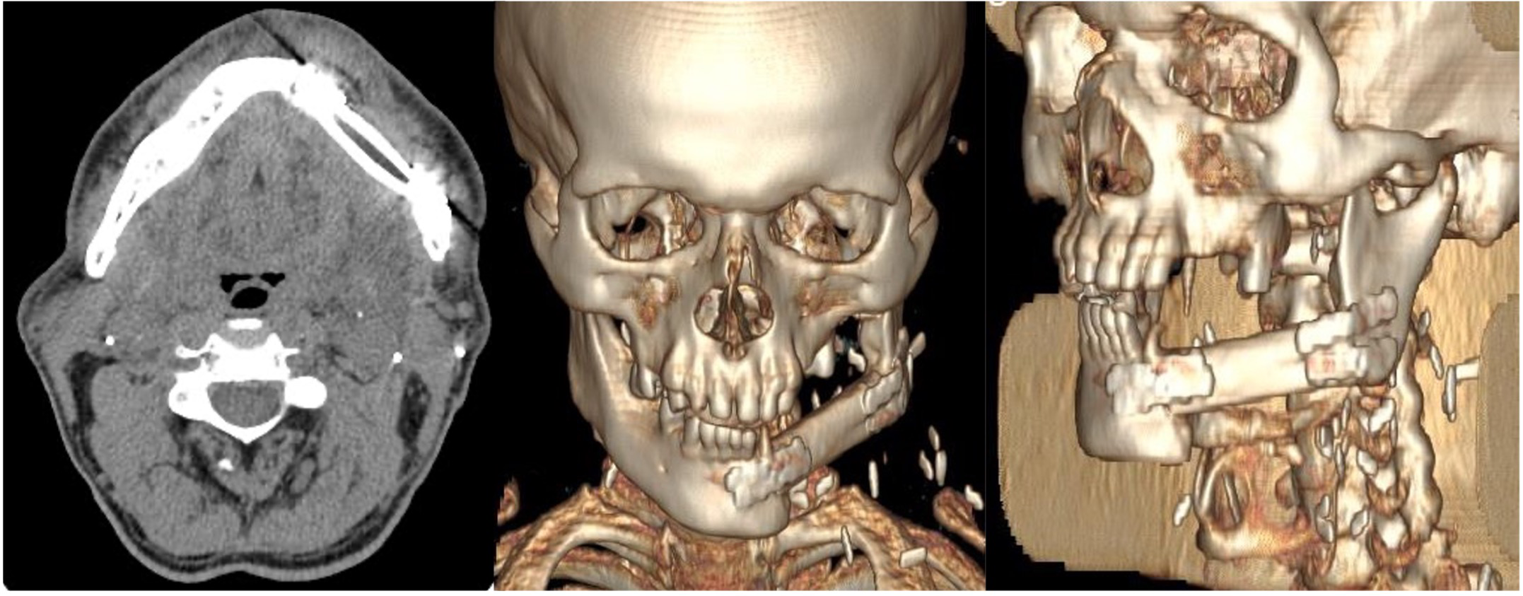 Post-operative CT scans of the patient showing correct placement of the free fibula flap to reconstruct the left hemimandibular defect. The flap is secured with miniplates to the residual mandibular segments and positioned superiorly at the level of the alveolar crest to ensure optimal future implant rehabilitation.