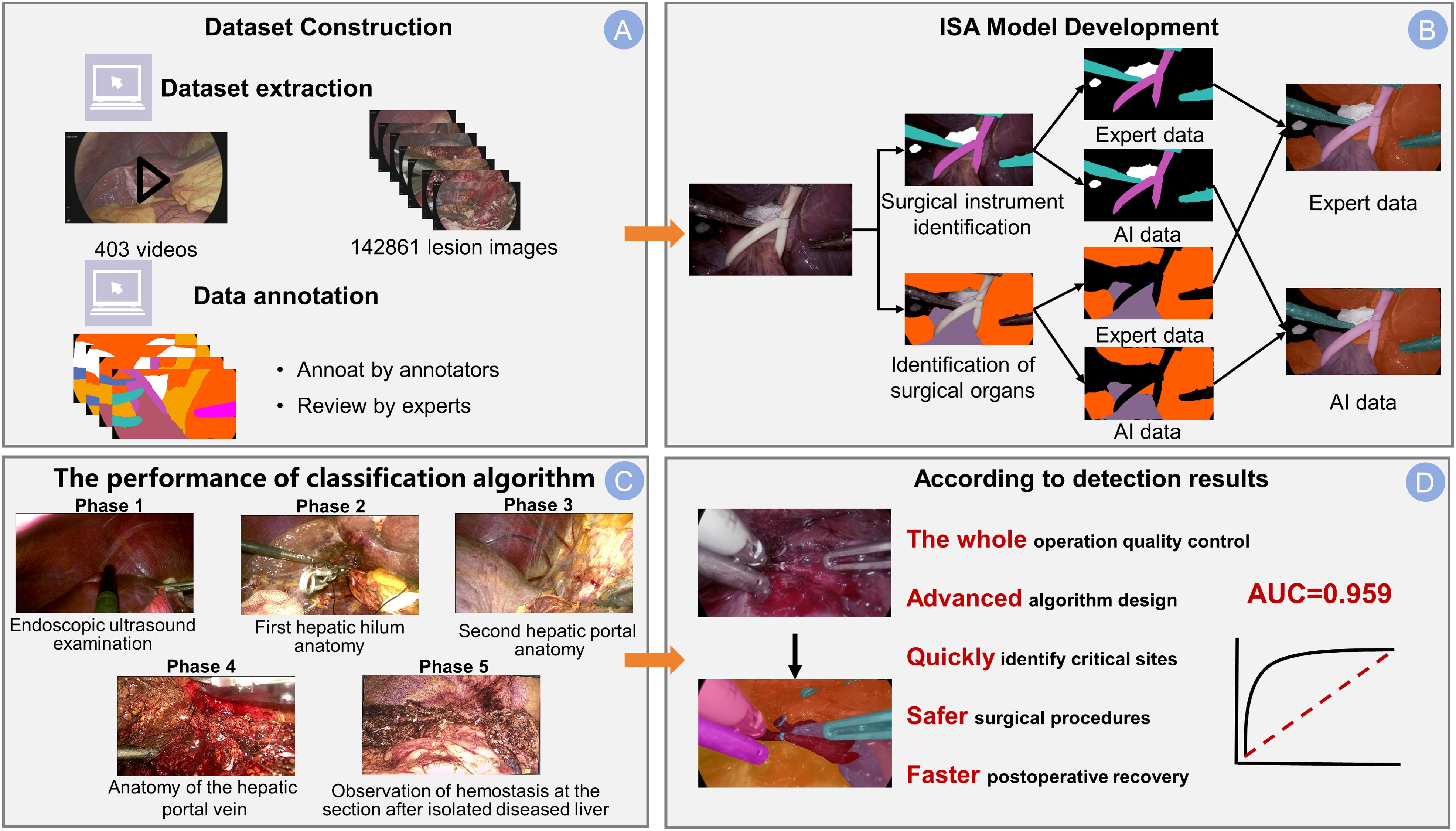 Figure 1. Integrated dataset and ISA model overview. (A) The dataset construction pipeline. The dataset was sourced from 403 surgical videos, and the process included frame extraction, annotation by junior surgeons, and final review by experts. (B) The development framework of the Intelligent Surgical Assistant (ISA) model with separate branches for identifying surgical instruments and anatomical structures. Example outputs are shown as expert-annotated masks (Expert data), compared to the model’s predicted segmentation (AI data) for both tasks. (C) The classification performance across five surgical phases: Phase 1 (Endoscopic ultrasound examination), Phase 2 (First hepatic hilum anatomy), Phase 3 (Second hepatic portal anatomy), Phase 4 (Anatomy of the hepatic portal vein), and Phase 5 (Observation of hemostasis at the resection site after removal of the diseased liver). (D) The significance of the detection results: this advanced algorithmic system enables whole-process quality control, accurately identifies critical sites (arrow), and contributes to safer surgical procedures and faster postoperative recovery. The model achieves an AUC of 0.959, demonstrating a robust discriminatory capability.