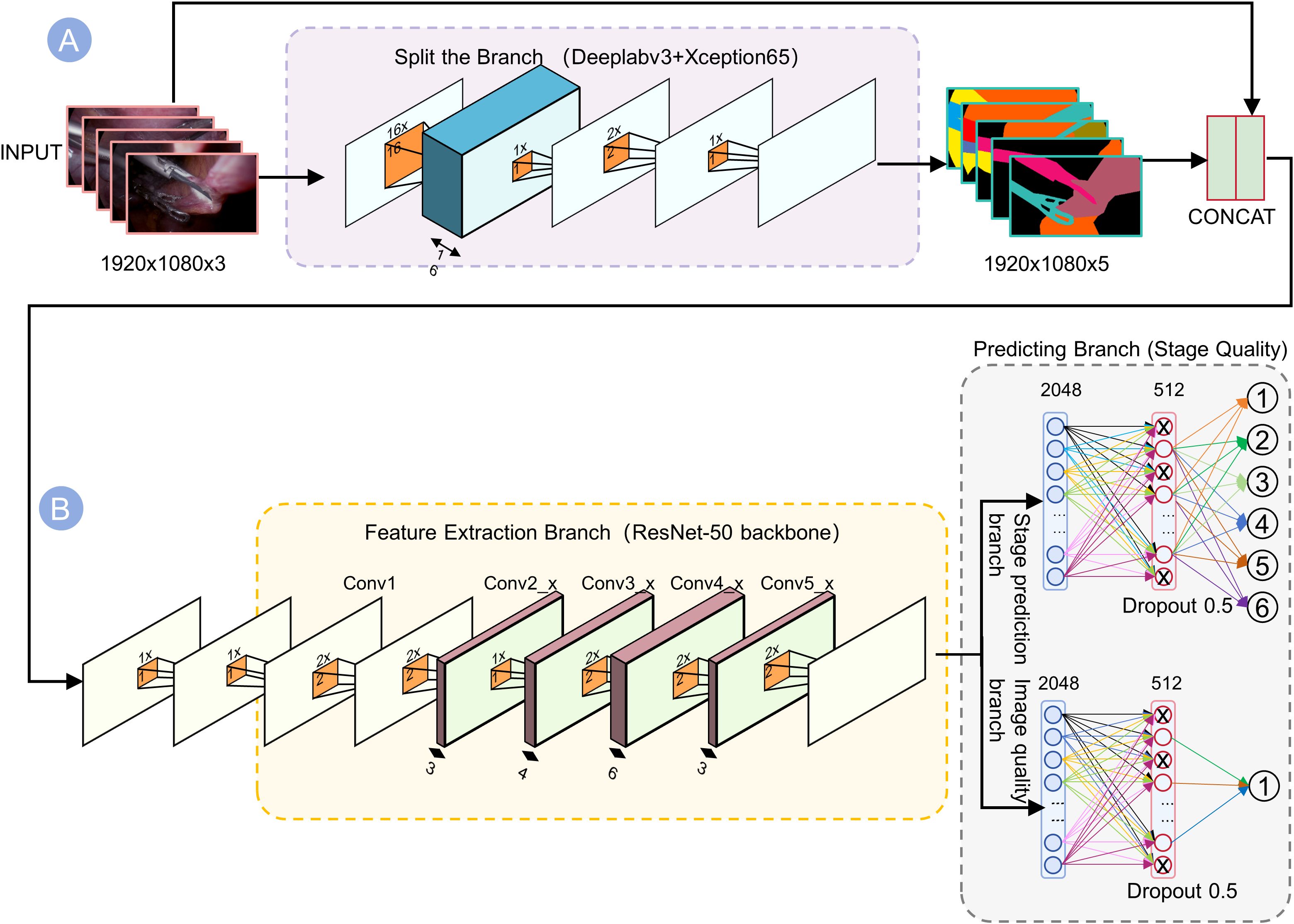 Figure 2. Dual-branch network architecture for joint prediction of stages and quality. (A) The top branch (Segmentation) uses DeepLabv3+ with Xception65 backbone to generate 5-channel outputs highlighting tools and anatomy. (B) The bottom branch (Feature Extraction) passes the image through ResNet-50 convolutional layers (Conv1–Conv5) to capture contextual information. These outputs are concatenated into a 1920×1080×5 tensor, which is then processed by two parallel dense “Predicting Branches” ending in softmax layers. By fusing segmentation cues with deep semantic features, the network robustly predicts the visual quality of each surgical phase.