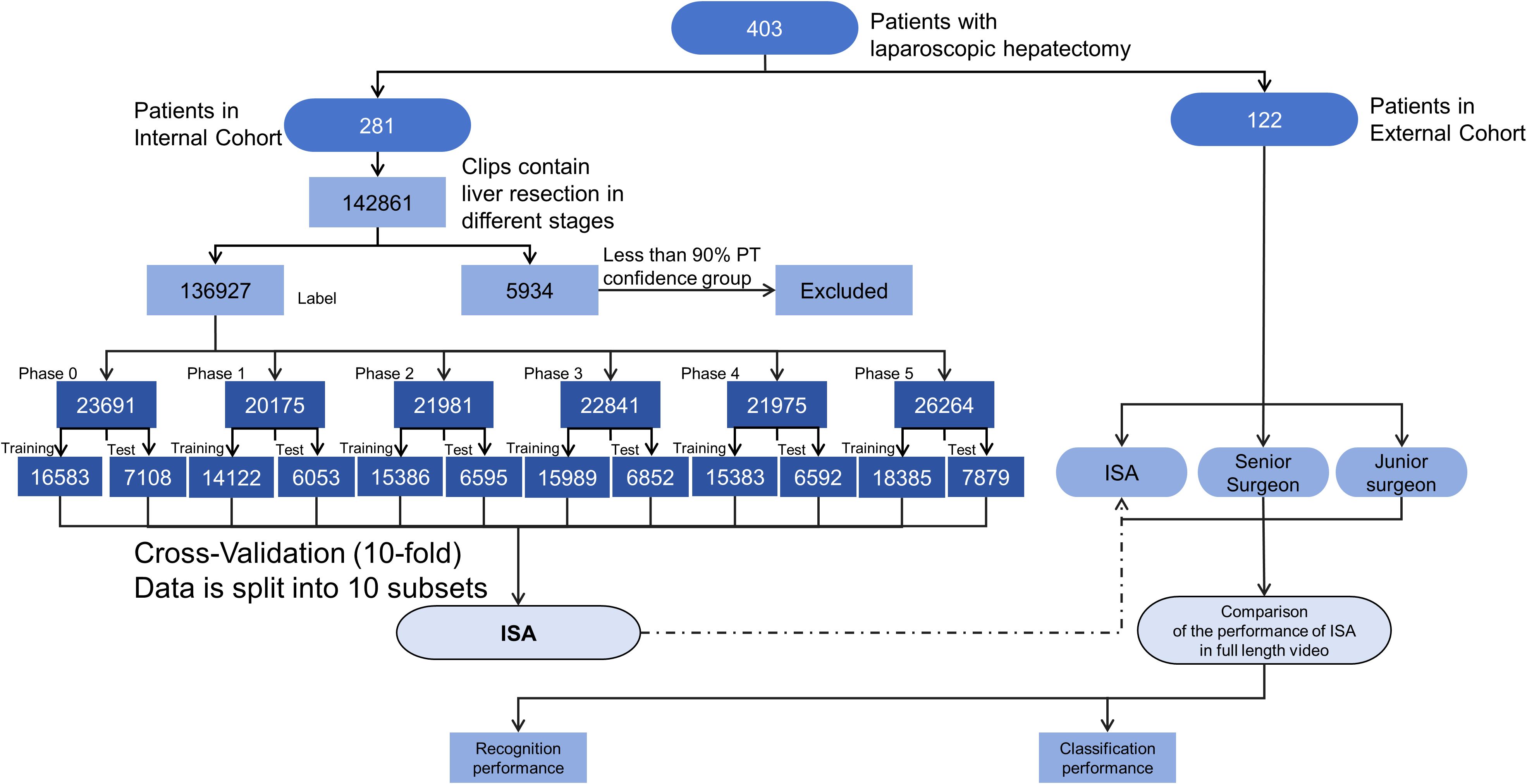 Figure 3. Flowchart of ISA development and evaluation. ISA refers to the Artificial Intelligence model constructed in this study for intraoperative phase recognition during laparoscopic hepatectomy. The flowchart outlines the entire pipeline including patient enrollment, video acquisition, phase-wise annotation, data screening, and model validation. Patients were divided into internal and external cohorts. Only clips with phase transition (PT) confidence above 90% were retained for analysis. A 10-fold cross-validation strategy was applied on the internal dataset for performance evaluation.
