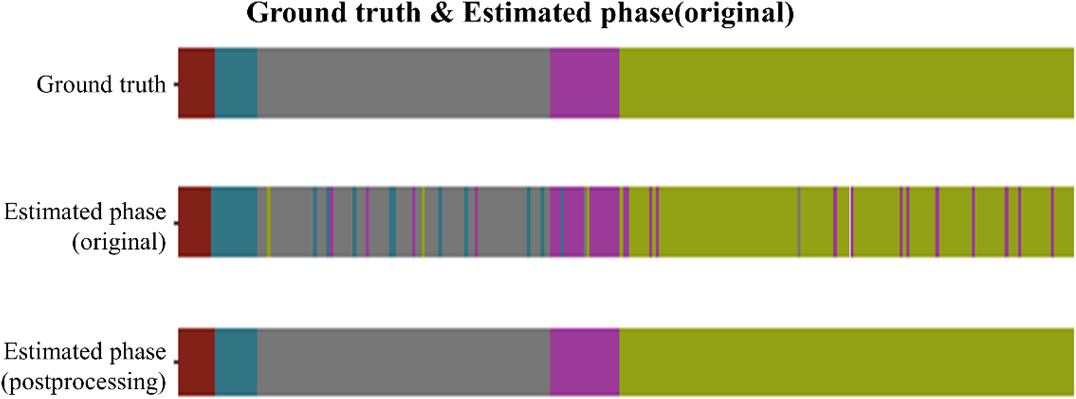 Bar diagrams comparing ground truth and estimated phases. The ground truth bar shows large segments of red, blue, gray, and purple with a long green section. The estimated phase (original) displays more fragmented colors with many thin lines, while the estimated phase (postprocessing) closely resembles the ground truth with fewer divisions.
