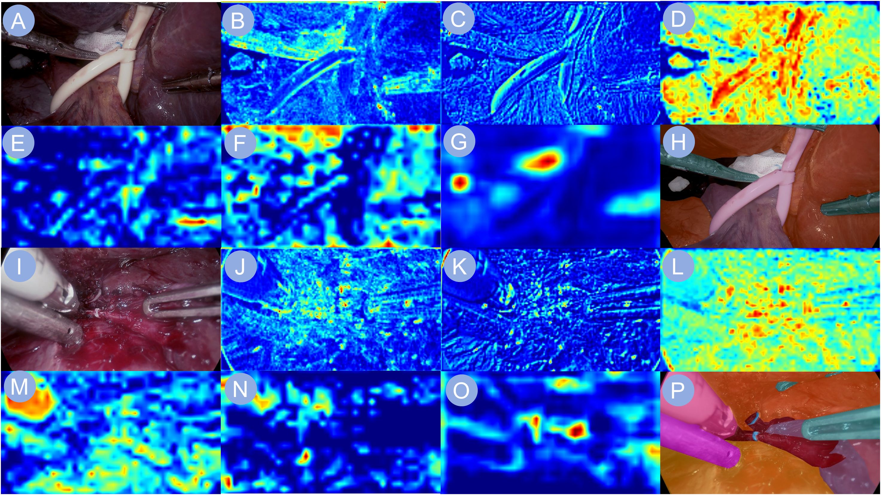 Figure 5. Heatmap visualizations of neural network activations. Heatmap visualizations of neural network activation are shown to illustrate the model’s response during phase recognition in liver surgery. (A, I) depict the input surgical images. (B–G, J–O) display the corresponding feature maps extracted by the backbone network, capturing key visual cues relevant to the identification of the first hepatic portal occlusion phase and the hepatic pedicle dissection phase, respectively. (H, P) present the final output images, highlighting the network’s interpretive focus for accurate surgical phase classification.