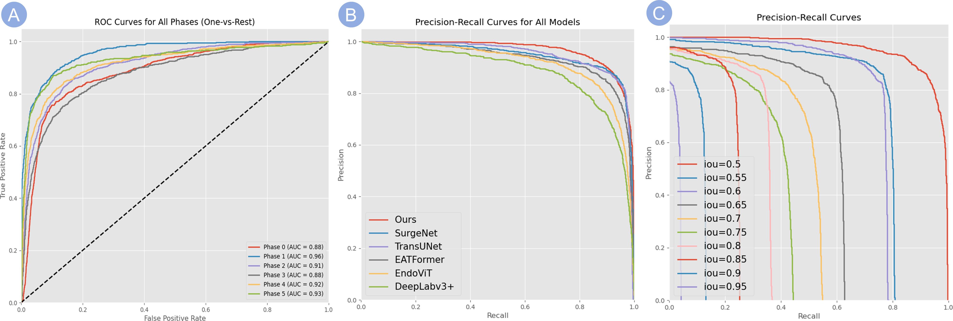 Figure 6. Evaluation of model classification performance. (A) ROC curves for the classification of all surgical phases (One-vs-Rest). The high AUC values for each phase demonstrate the model’s robust discriminatory power. (B) PR curves comparing our model’s performance against several baseline methods, showing that our model consistently achieves higher precision across varying recall levels. (C) PR curves for our model evaluated at increasingly stringent IoU thresholds (from 0.5 to 0.95), demonstrating robust performance even at high IoU values and reflecting its strong spatial localization capabilities.