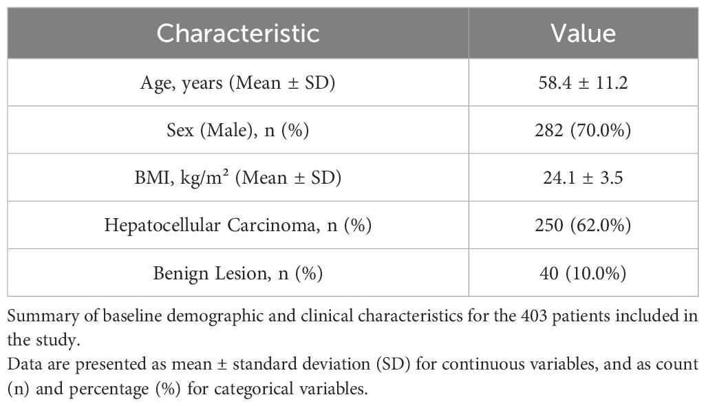 This retrospective study included a cohort of 403 patients who underwent laparoscopic hemi-hepatectomy between August 2023 and August 2024, from which 403 surgical videos were obtained from four participating centers. The inclusion criteria were: (1) adult patients (age > 18 years); (2) undergoing elective laparoscopic hemi-hepatectomy; (3) availability of complete, high-quality surgical video recordings; and (4) provision of informed consent for the research use of video data. Exclusion criteria were: (1) emergency surgeries; (2) procedures converted to open surgery due to non-oncological reasons (e.g., equipment failure); (3) patients with prior major upper abdominal surgery; and (4) videos with significant portions obscured by technical issues or poor quality. The baseline demographic and clinical characteristics of the patient cohort are summarized in Table 1.