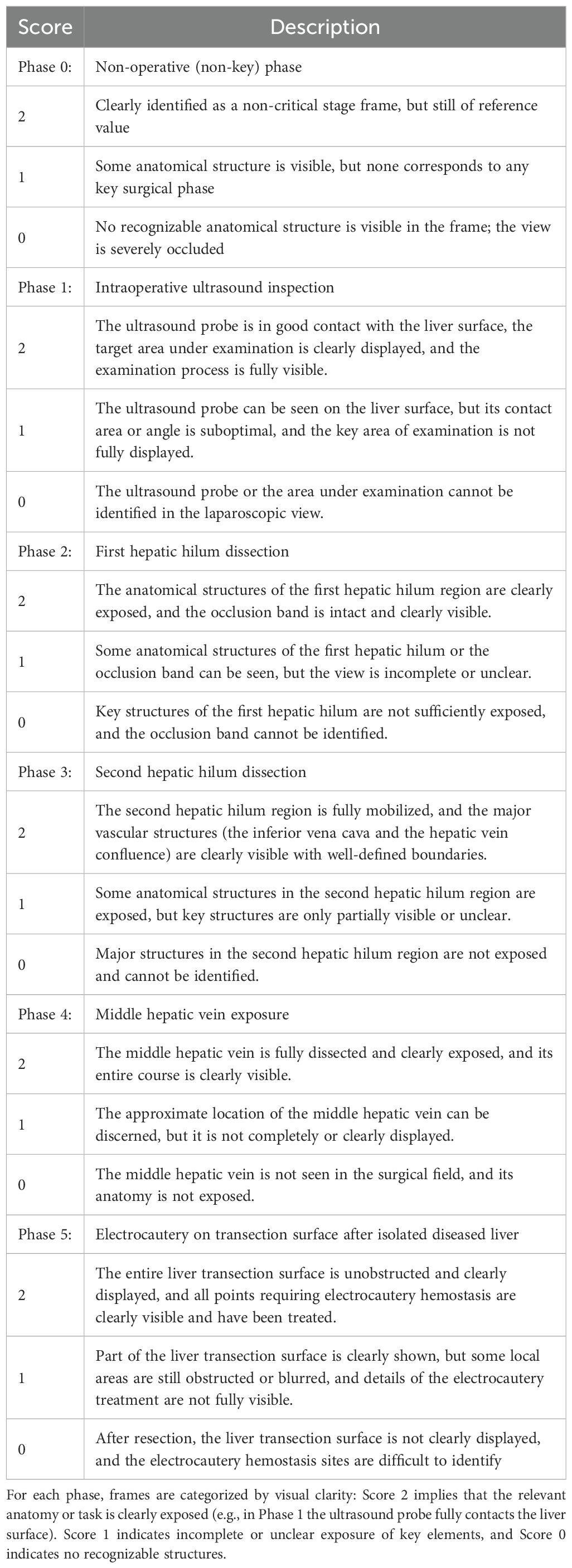 Table 2 defines a three-point system (0–2) for scoring the clarity in each of the five phases of laparoscopic liver resection, including: Phase 1 (intraoperative liver ultrasound), Phase 2 (first porta hepatis dissection), Phase 3 (second porta hepatis dissection), Phase 4 (middle hepatic vein exposure), and Phase 5 (electrocoagulation of the liver section surface). Phase 0 was set as a non-critical background phase. For each phase, a score of 2 represented a full visualization of anatomical structures and an optimal position of the camera, 1 indicated partial anatomical exposure or a suboptimal position, and 0 denoted indistinguishable anatomical structures or an obstructed vision (e.g., smoke, blood, off-target lens). The clinical validity of this scoring system is rooted in its development by senior hepatobiliary surgeons and its direct correlation with intraoperative safety. The criteria for each score were established through expert consensus based on extensive surgical experience. A high clarity score (Score 2) represents an optimal surgical field, which is a prerequisite for the safe identification of critical anatomical structures and the prevention of iatrogenic injury. Conversely, a low score (0 or 1) signifies a compromised view due to factors like bleeding, smoke, or suboptimal exposure. Such situations are clinically significant as they substantially increase the risk of complications. Therefore, this scoring system serves as a clinically relevant and valid proxy for quantifying the quality and safety of the operative field in real-time.