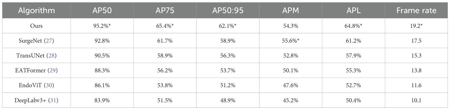 As shown in Table 3, our method achieves the best performance across most evaluation metrics. Specifically, it obtains the highest values in AP50 (95.2%), AP75 (65.4%), and AP50:95 (62.1%), outperforming the second-best method SurgeNet by 2–4 percentage points. It also ranks first in APL (64.8%), indicating better performance in detecting large anatomical structures. While SurgeNet achieves a slightly higher APM (55.6%), our method remains competitive at 54.3%, demonstrating consistent performance across different object scales.