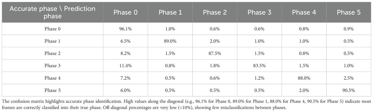 While overall misclassifications were rare (<8% for any off-diagonal), a closer analysis of the confusion matrix (Table 4) reveals that the most frequent misclassification occurred between Phase 3 and Phase 0 (11.4%), suggesting that the final moments of the second hilum dissection can be visually similar to non-critical operative steps. Similarly, some confusion was observed between Phase 2 and Phase 0 (8.2%). These specific transition errors highlight key areas for future model refinement.
