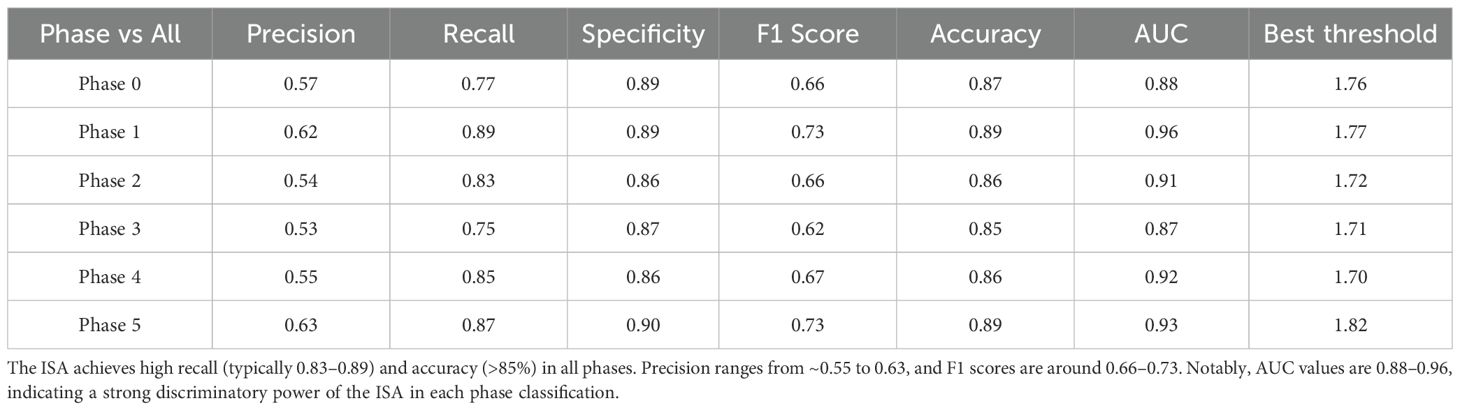 As shown by the results from the validation cohorts (Figure 6A), the ISA achieved the highest AUC (0.9598) in Phase 1, followed by Phase 5 (0.93), Phase 4 (0.92), Phase 2 (0.9137). In Phase 0 and Phase 3, the AUCs were slightly lower (0.8839, 0.8776, respectively), reflecting the relatively weaker yet still reliable discriminatory ability of the ISA.