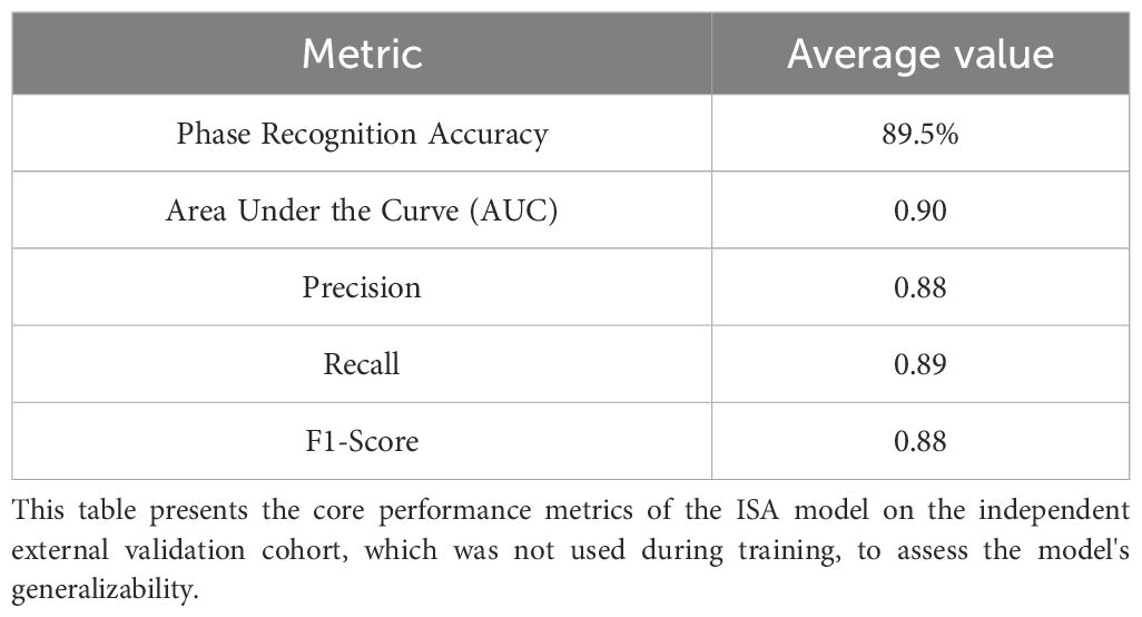 To rigorously assess the model’s generalizability, we evaluated its performance on a completely independent external validation cohort, which consisted of 122 surgical videos from a center whose data was not used for training. The ISA was applied to this unseen dataset without any retraining or fine-tuning.