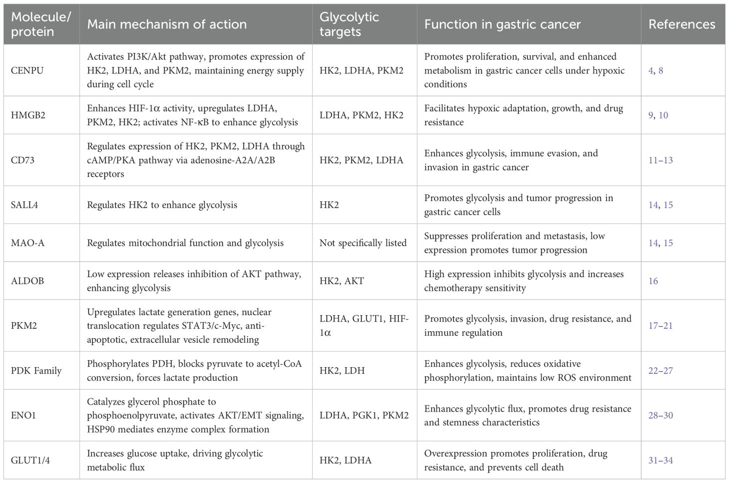 Lactate dehydrogenase (LDH), which catalyzes the terminal step of glycolysis by converting pyruvate to lactate and regenerating NAD+, is highly expressed in gastric cancer (40). Inhibition of this process—e.g., via β-sitosterol—impairs NAD+ regeneration, disrupts glycolysis, and induces apoptotic signaling such as mitochondrial depolarization and caspase activation (41). Studies on these key enzymes and proteins provide a critical molecular basis for understanding the glycolytic phenotype in gastric cancer and offer promising targets for therapeutic development.