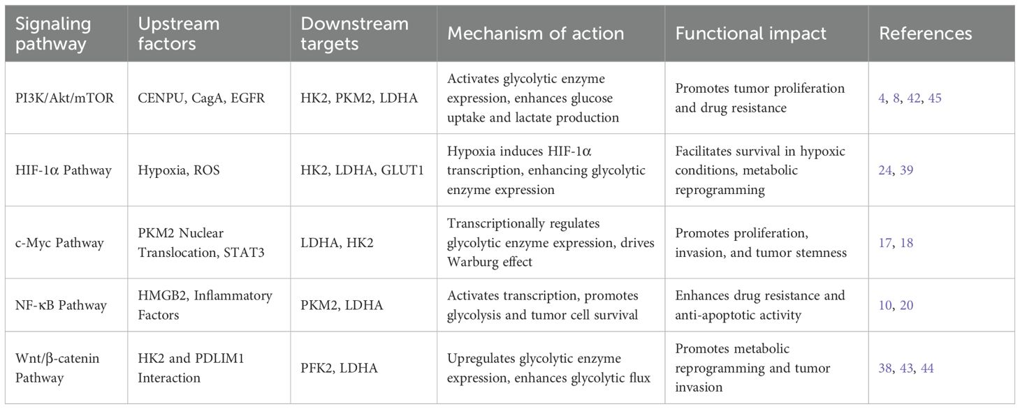 The PI3K/Akt/mTOR signaling pathway plays a central role in the regulation of glycolysis(As shown in Table 2). In gastric cancer, MAOA (monoamine oxidase A) is generally downregulated, but its re-expression has been shown to suppress the PI3K/Akt/mTOR pathway via interaction with NDRG1. This inhibition leads to reduced activity of the downstream transcription factor HIF-1α, thereby decreasing the expression and function of key glycolytic regulators including GLUT1, HK2, PFK1, PKM2, and LDHA. The result is a significant reduction in glucose uptake, extracellular acidification rate (ECAR), and lactate production, while mitochondrial oxidative metabolism is enhanced, ultimately suppressing cell proliferation and migration and promoting apoptosis (45). Similar inhibitory effects on this pathway have been demonstrated in other gastric cancer models, such as Bufalin treatment (46, 47), and in related tumor studies involving TRIM59 suppression (48) and ILF3 overexpression (49), further reinforcing the critical role of the PI3K/Akt/mTOR axis in maintaining aberrant tumor metabolism.