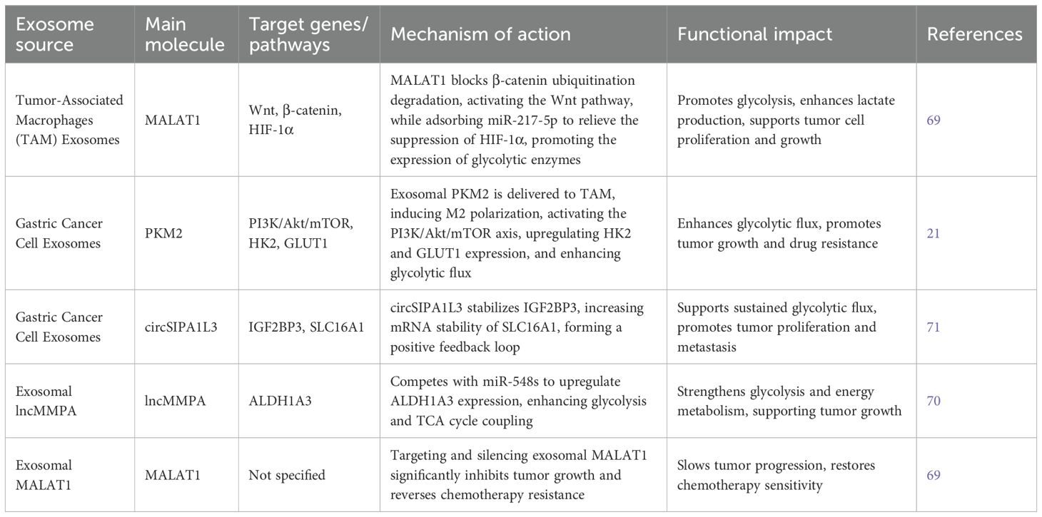 Conversely, gastric cancer cells secrete PKM2-enriched exosomes that are taken up by TAMs, inducing their polarization toward the M2 phenotype and activating the PI3K/Akt/mTOR axis in a feedback loop. This signaling cascade enhances glycolytic flux by upregulating hexokinase (HK2) and glucose transporter (GLUT1) expression (21). Additionally, exosomal lncMMPA competitively binds miR-548s to upregulate ALDH1A3, further strengthening the coupling between glycolysis and the tricarboxylic acid (TCA) cycle (70). Moreover, glycolytic byproducts such as lactate stabilize IGF2BP3 via circSIPA1L3 carried in exosomes, increasing the mRNA stability of lactate transporter SLC16A1 and forming a positive feedback loop to sustain glycolysis (71).