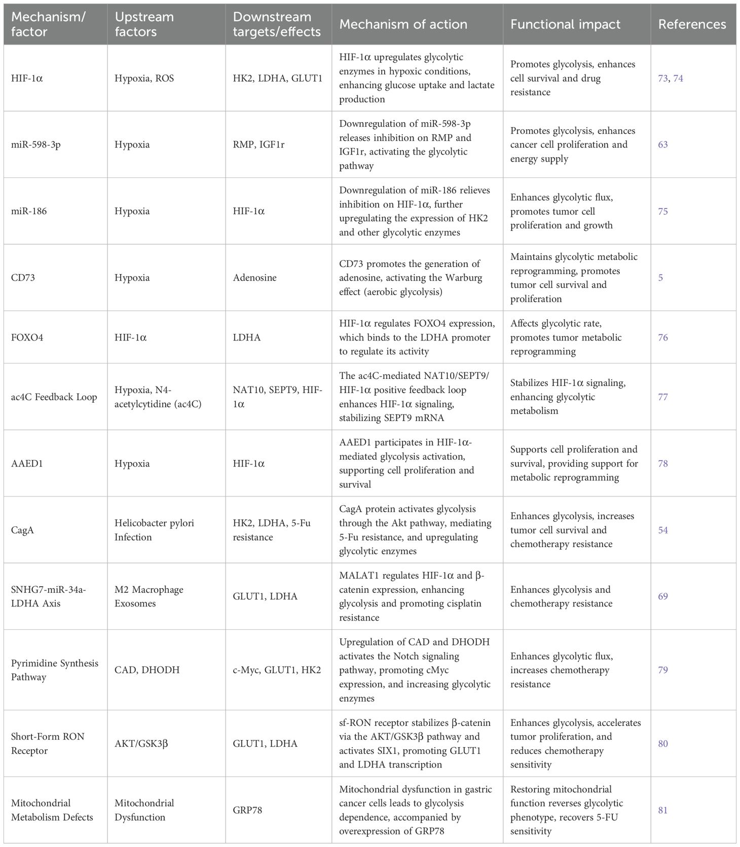 Glycolysis significantly contributes to the development of chemoresistance in gastric cancer (As shown in Table 5). One study revealed that the Helicobacter pylori virulence factor CagA induces resistance to 5-fluorouracil (5-FU) by activating the Akt pathway and upregulating glycolysis. Specifically, CagA expression is significantly elevated in 5-FU–resistant gastric cancer cells, along with increased expression of glycolytic enzymes such as hexokinase 2 (HK2) and lactate dehydrogenase A (LDHA). This enhanced glycolytic activity supports cancer cell survival. Inhibition of glycolysis or the Akt pathway effectively reverses this resistance and restores 5-FU cytotoxicity, providing new insight into therapeutic strategies (54).