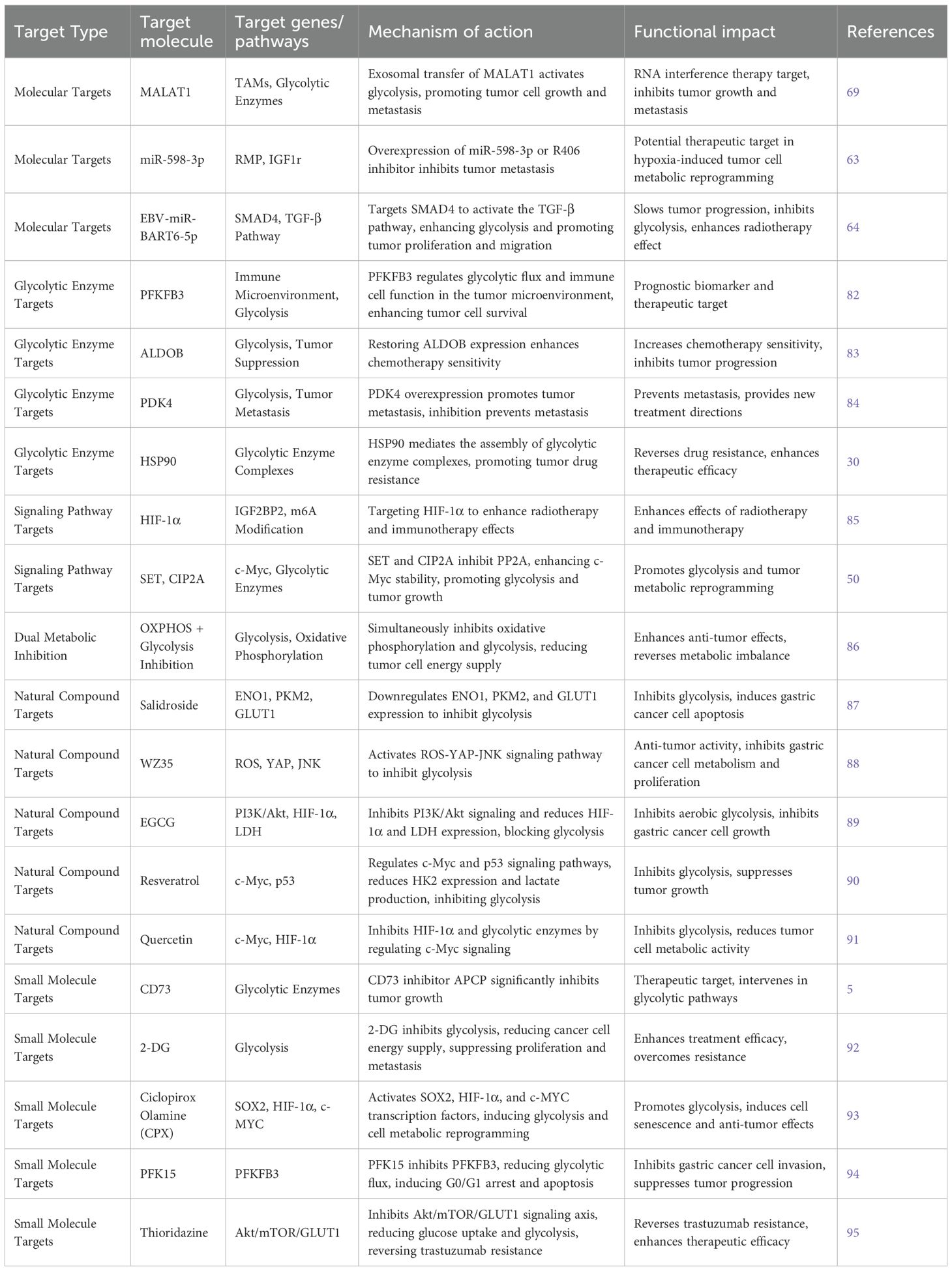 These findings highlight the potential of small molecule inhibitors and enzyme modulators in targeting glycolysis for gastric cancer therapy, offering novel therapeutic strategies for overcoming resistance and improving treatment efficacy.