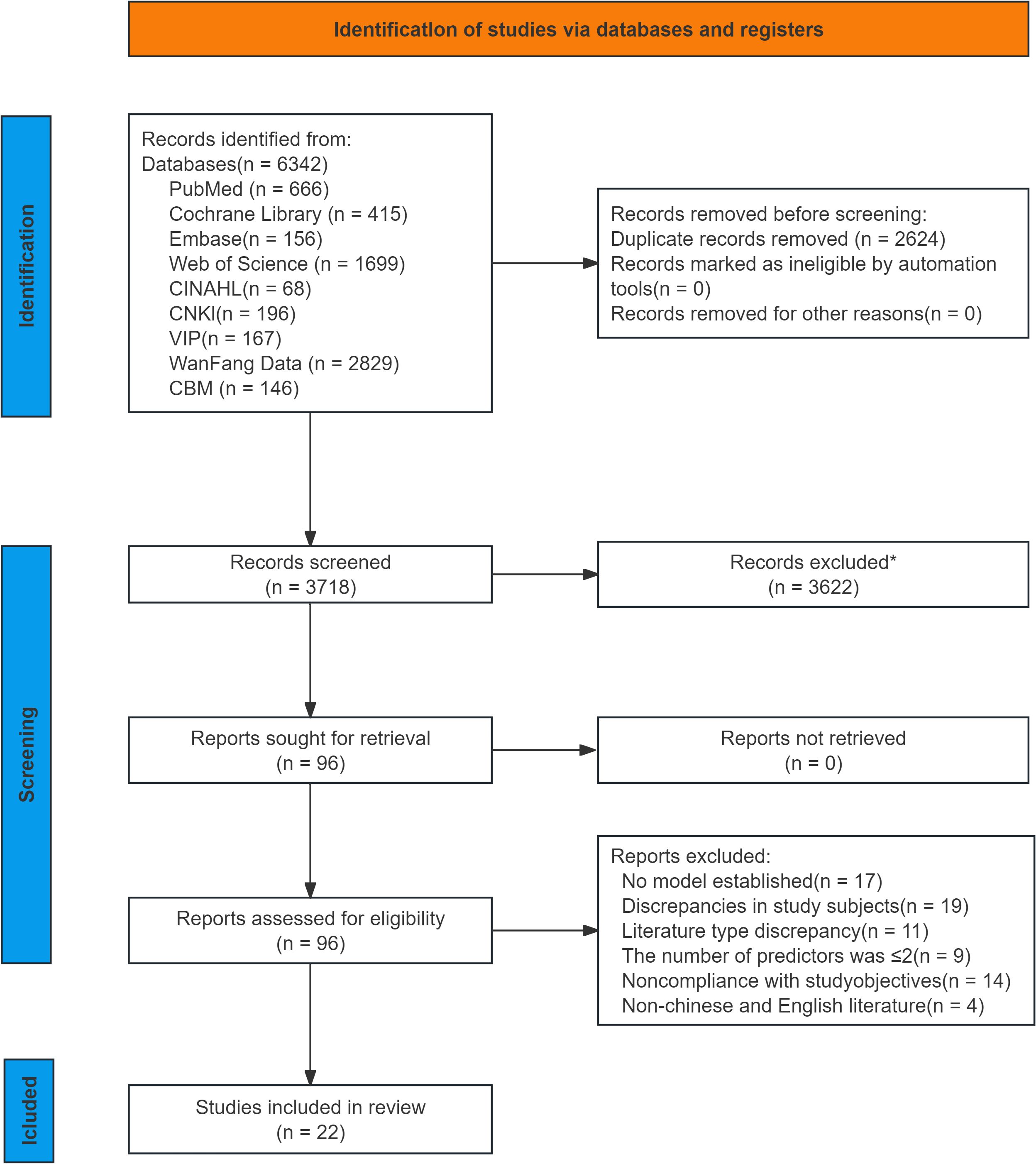 In this review, 6,342 relevant studies were retrieved through preliminary screening. After duplicate records were removed using EndNote software, 3,718 records remained. A further 3,622 studies were excluded after reading the titles and abstracts. Following this process, 96 studies were selected for full-text retrieval, and those that met the following exclusion criteria were excluded: no model was established, mismatched research purposes, inappropriate study subjects, insufficient predictors, and inconsistent literature types. Finally, 22 studies (12–33) were included in this review. Overall, the PRISMA flow diagram (Figure 1) of this study demonstrates the rigorous process of selecting studies that meet the inclusion criteria for the systematic review.