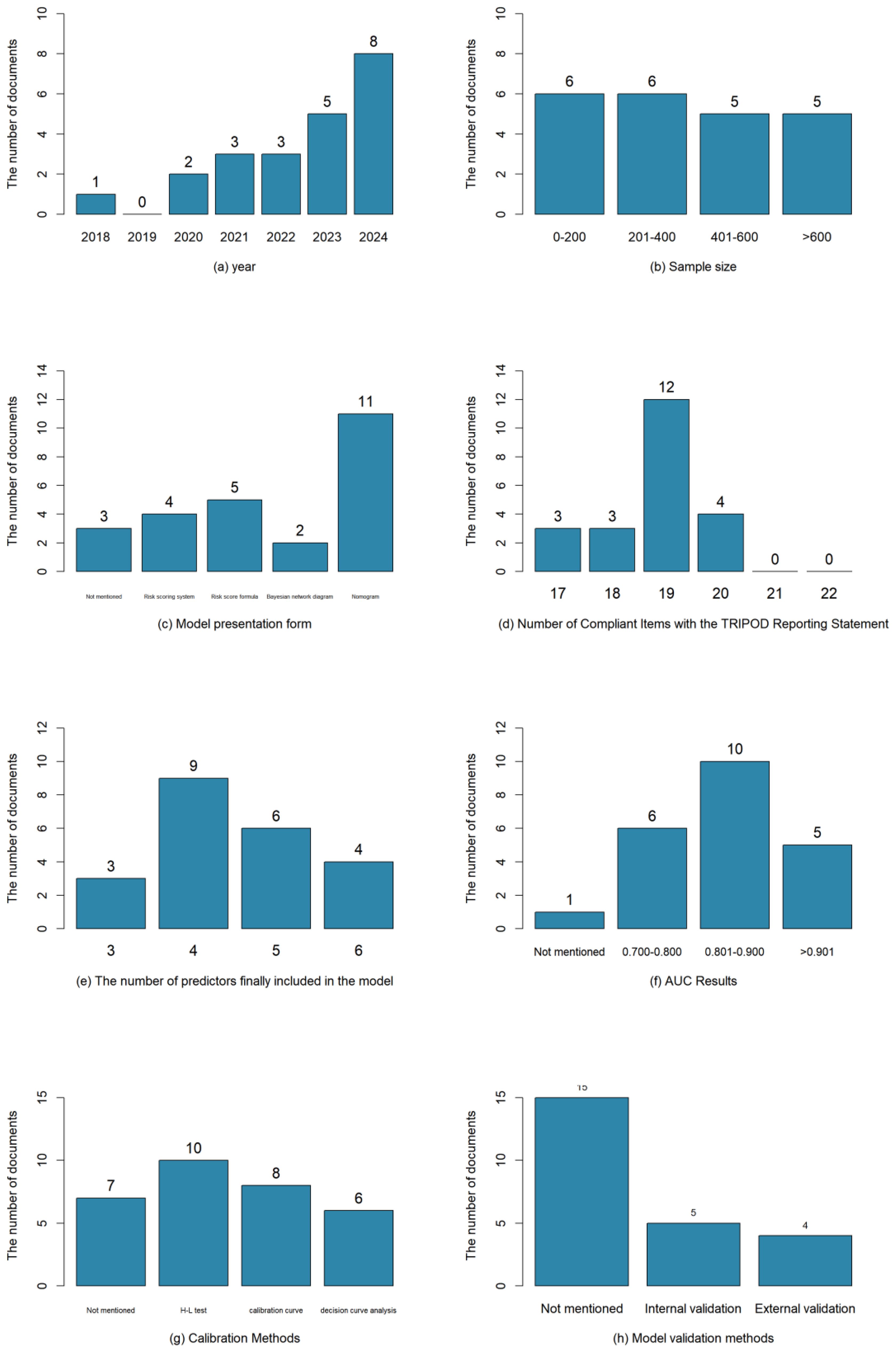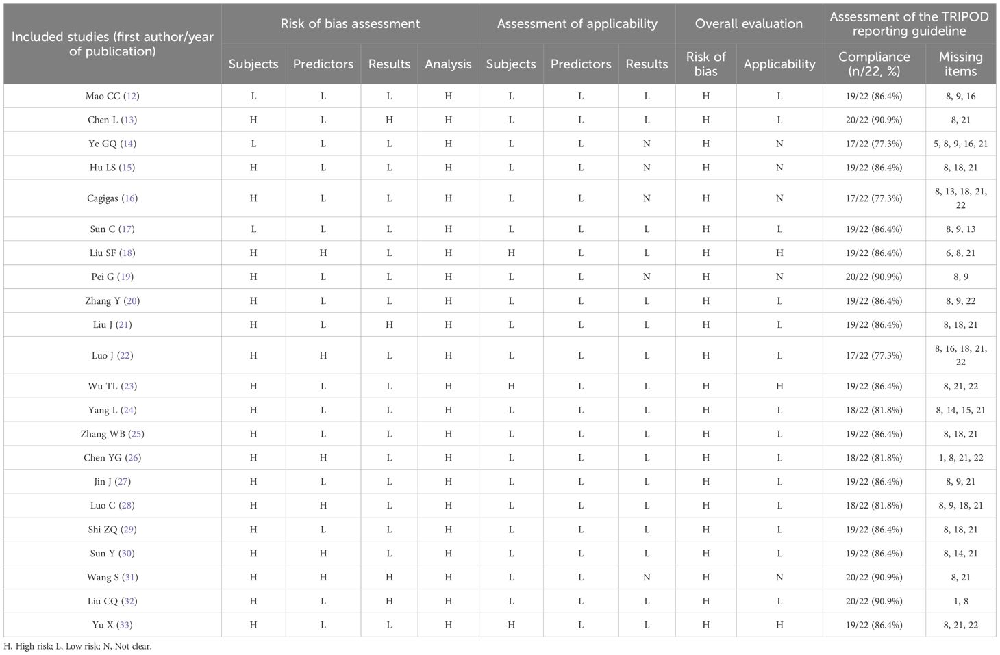 Studies with higher reporting quality may reflect more rigorous validation methods and more reliable performance estimates. In this study, an assessment of the 22 included studies (12–33) was conducted against the TRIPOD reporting guidelines. Results showed that the reporting quality of the studies varied, with TRIPOD compliance ranging from 77.3% (17/22) to 90.9% (20/22). The commonly underreported items included "explaining how the study sample size was determined" (Item 8) and "providing supplementary materials and information, such as study protocols, web-based calculators, and datasets" (Item 21). The results of the literature evaluation were shown in Table 4. The visual presentation of the basic information of the included studies is shown in Figure 2.