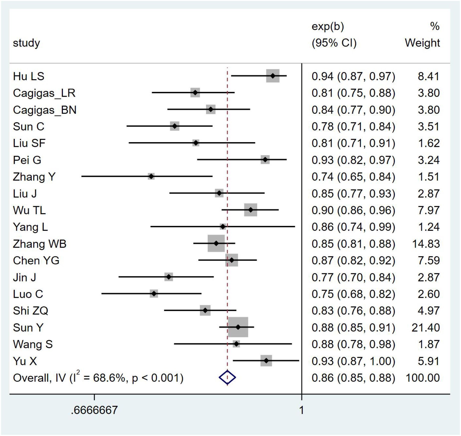 In this study, the area under the receiver operating characteristic curve (AUC) was chosen as an indicator of discrimination ability. AUC was pooled by a random-effects model to assess overall discrimination across all prediction models and across clinical settings. Meta-analysis was performed using Stata 16.0 software. The odds ratio (OR) and 95% confidence interval (95% CI) were used as effect size statistics. The Q test and I² heterogeneity index were applied to assess the presence of heterogeneity: If I² <50% and P >0.1, the homogeneity was considered acceptable, and a fixed-effects model was used for analysis; if I² >50% and P <0.01, further sensitivity analysis was conducted; if heterogeneity could not be eliminated, a random-effects model was adopted for analysis. A P <0.05 was considered statistically significant.