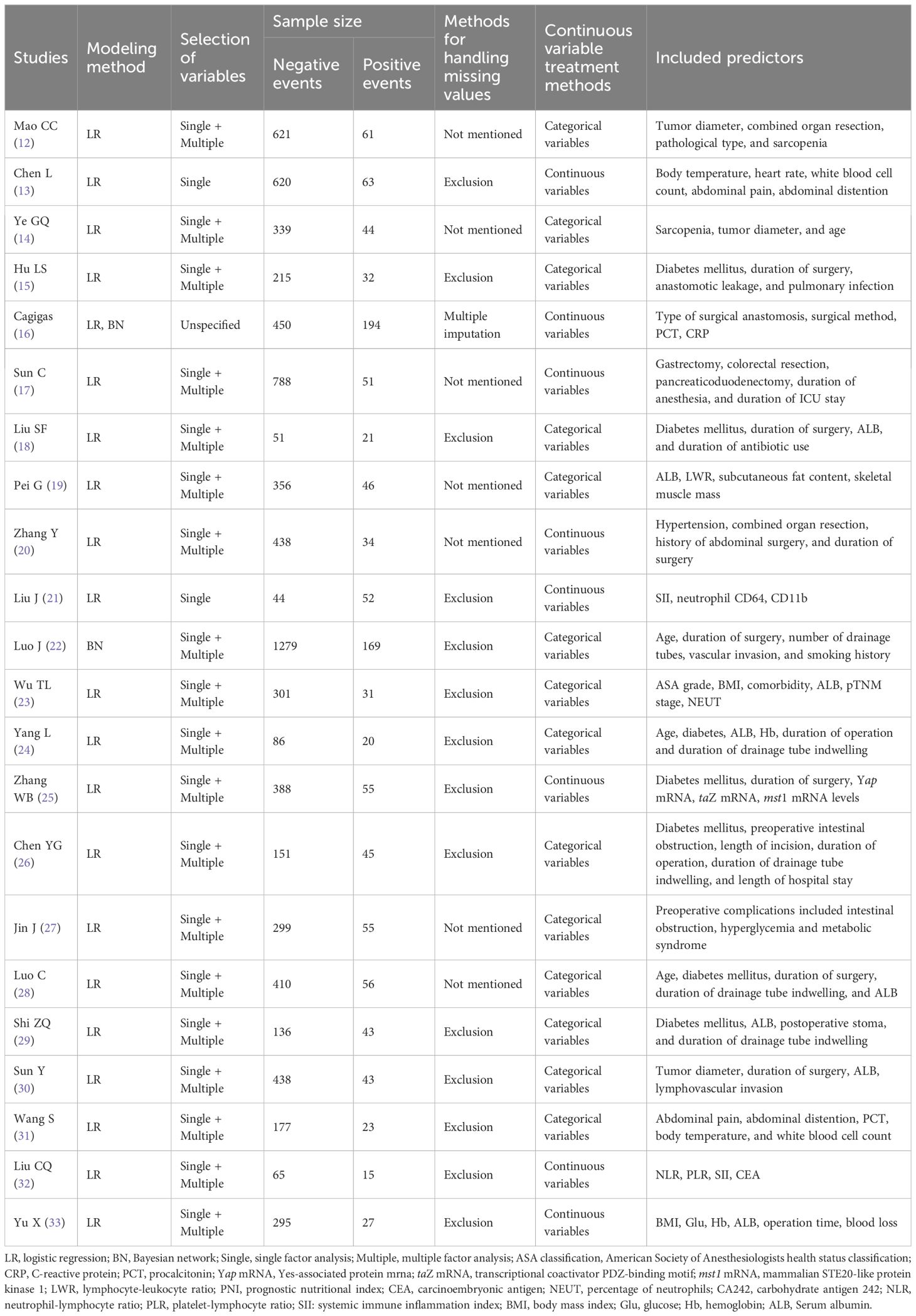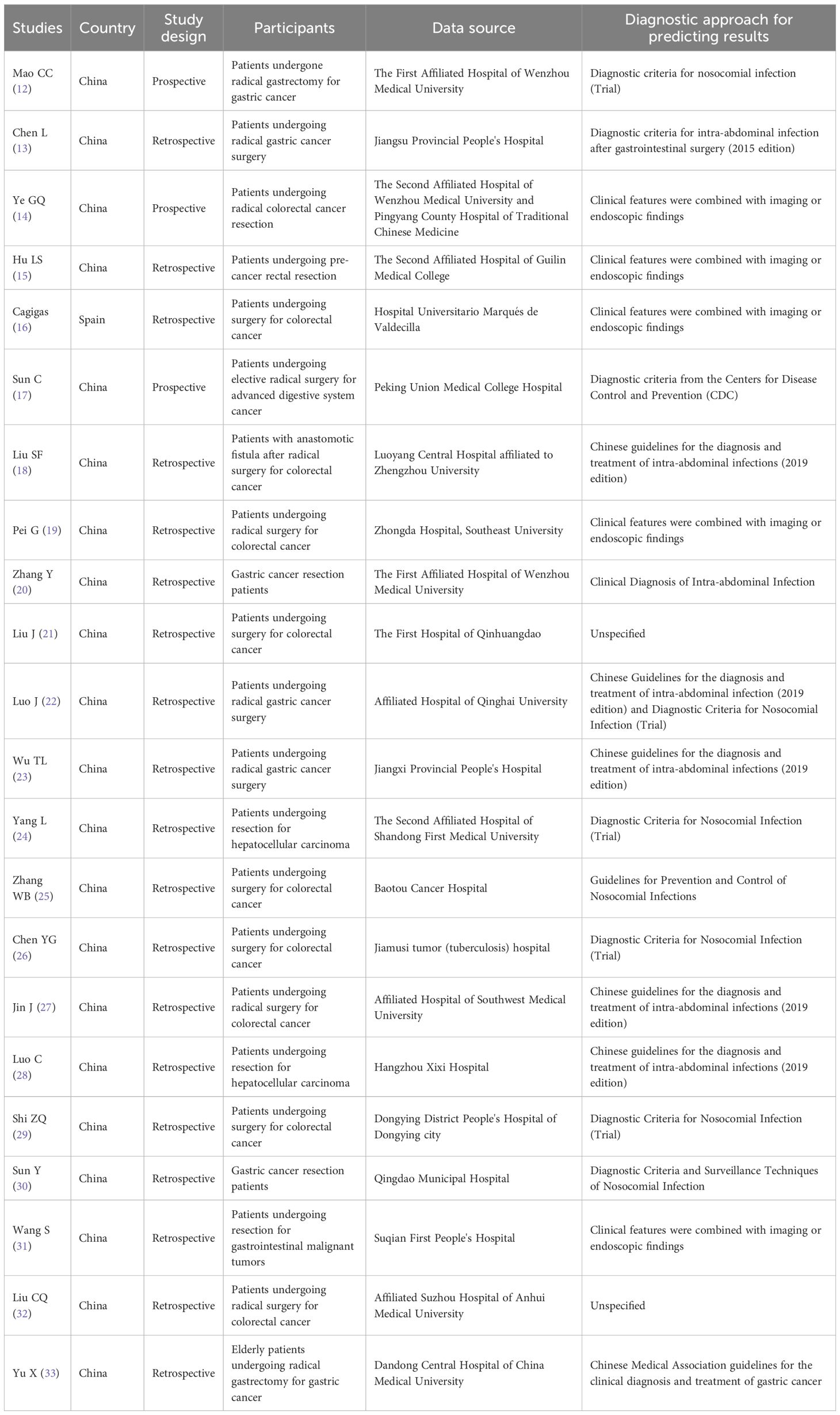 The total number of samples included in the literature was 9,127 cases, and the number of outcome events ranged from 15 to 194 cases; the studies were published between 2004 and 2023, of which 19 studies (15–33) were in the last 5 years; three studies (12, 14, 17) were prospective study designs, and the remaining were retrospective studies. The basic characteristics of the included studies were shown in Table 1.