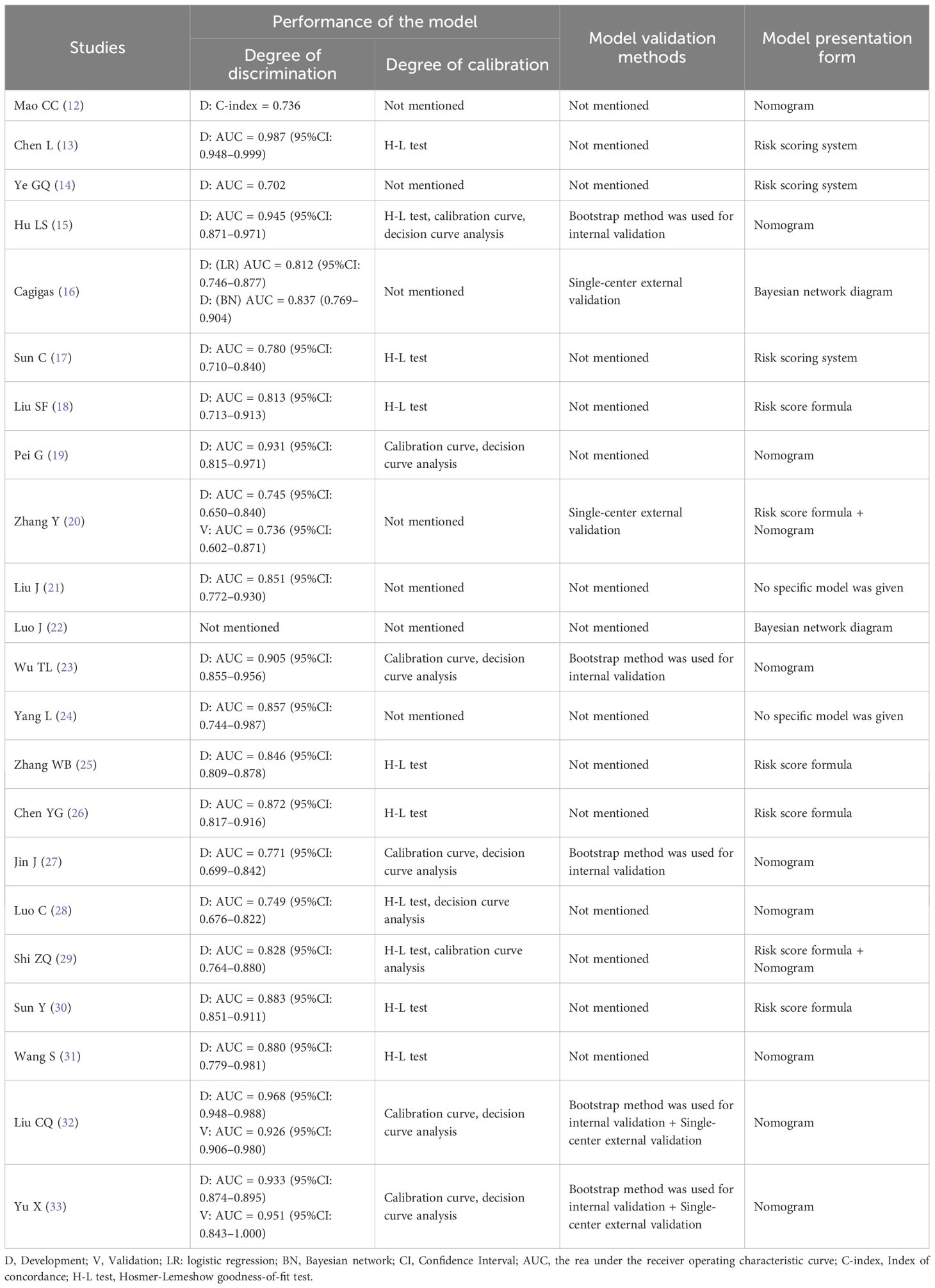 A total of 23 models were constructed. One study (16) used multiple interpolation to handle missing data, seven studies (12, 14, 17, 19, 20, 27, 28) did not report the method for missing data, and the remaining studies excluded subjects with incomplete data when determining the inclusion and exclusion criteria; in terms of modeling methods, one study (22) chose Bayesian network for modeling, one study (16) carried out both logistic regression and Bayesian network modeling, and the remaining studies adopted logistic modeling; as for model presentation, eleven models (12, 15, 19, 20, 23, 27–29, 31–33) were finally presented as nomogram, two studies (21, 24) did not report the form of model presentation, and two studies (16, 22) presented models through Bayesian network, and the rest were presented as risk scoring formulas or scoring systems.