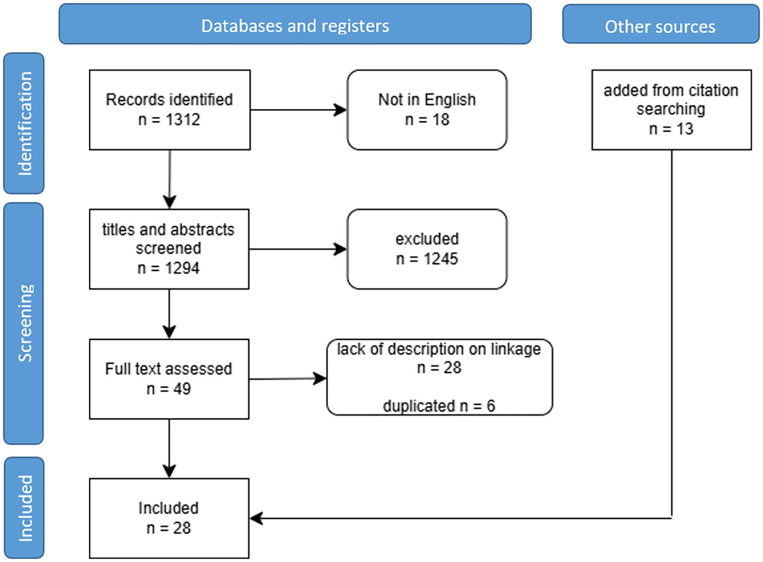 In total, 1312 articles were initially identified, including 516 from PubMed and 796 from Embase. After scanning the titles and abstracts, 1245 articles were excluded, leaving 49 for full-text reading. Among these, six duplicate articles and 28 articles lacking data linkage descriptions were further excluded. Remaining fifteen articles (n=15) met the inclusion criteria (Figure 1).