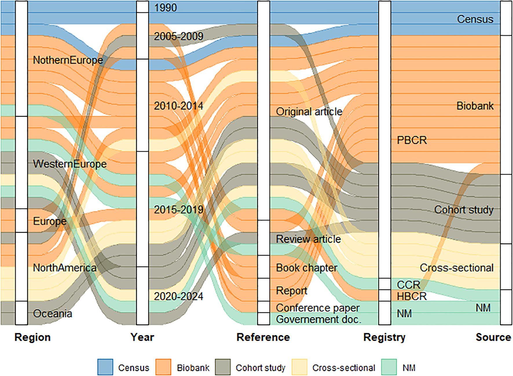 Evidence selection bias may have been introduced because of the decision to restrict the study’s search strategy to the PubMed and Embase databases and use a backward snowballing approach on Google Scholar (80). However, the scoping review only examined the linkage between PBCRs and biobanks and/or administrative or sociodemographic databases. This provides valuable insights into the linkage activities with respective sources. Although, a wider systematic review is required, including other potential secondary data sources (e.g., electronic health records, institutional or organizational databases, and several others).