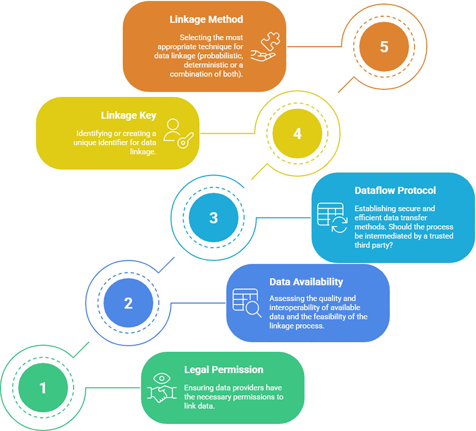 Figure 3. Five key domains and related questions to be considered, step by step (1 to 5), prior to establishing data linkage.
