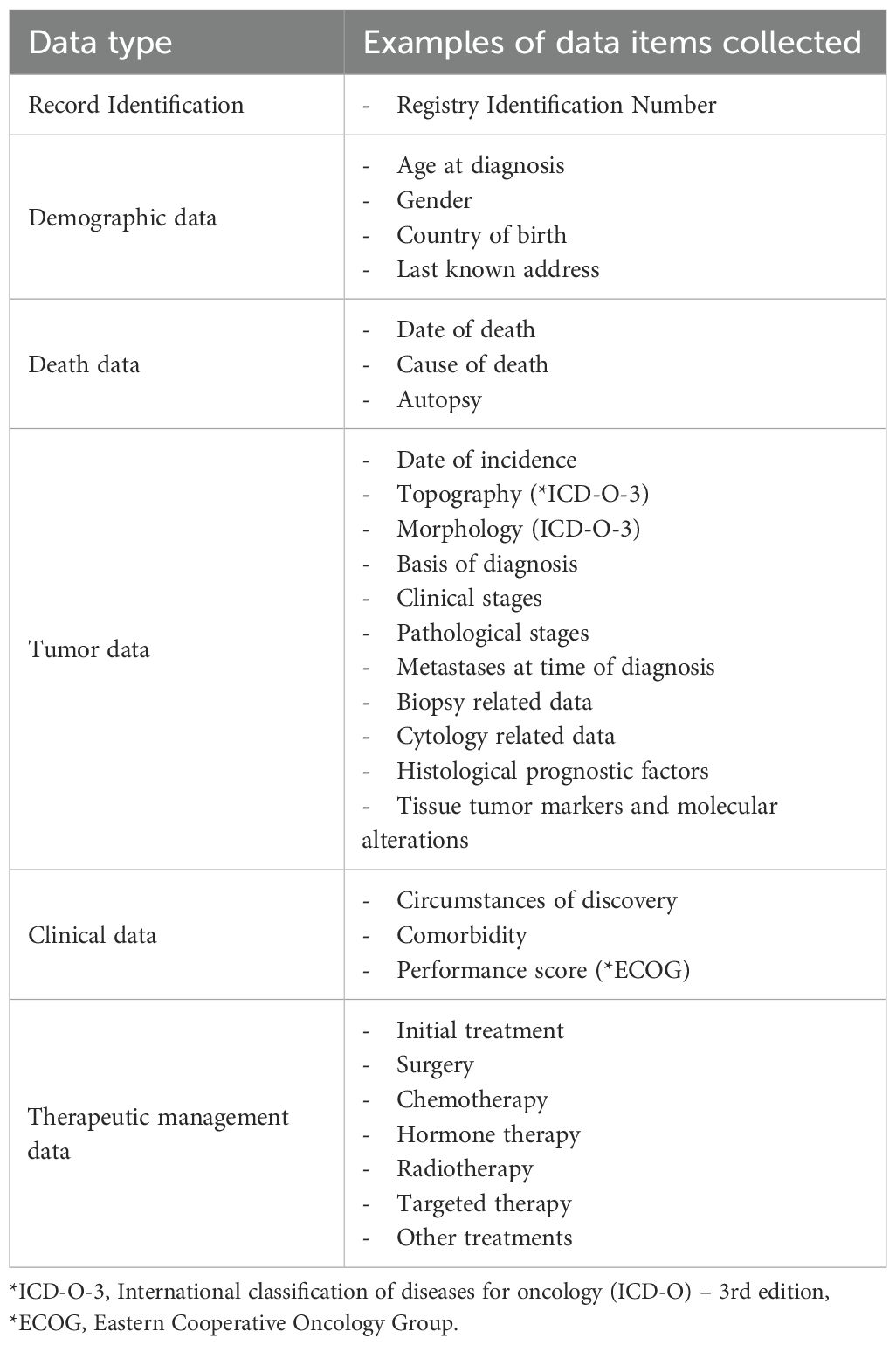 The Luxembourg’s National Cancer Registry (in French: Registre National du Cancer du Luxembourg, RNC) is the official data collection of all new cancer cases diagnosed and/or treated in Luxembourg, for both residents and non-residents, in order to have an overview of all cancer patients being cared for in Luxembourg (Table 1). The RNC was established to monitor cancer incidence, mortality, and survival trends, to assess the effectiveness of treatments offered to patients, and to evaluate the efficiency of public health prevention efforts, screening programs, and to compare outcomes at international level (16). It also serves as an infrastructure to support epidemiological and clinical cancer research, aligning with national goals to enhance translational and precision cancer research (17). Created in 2013, the RNC is one of Europe’s youngest PBCR. The RNC facilitates national and international comparisons and supports public authorities to plan and tailor health services aligned to the identified needs of the population.