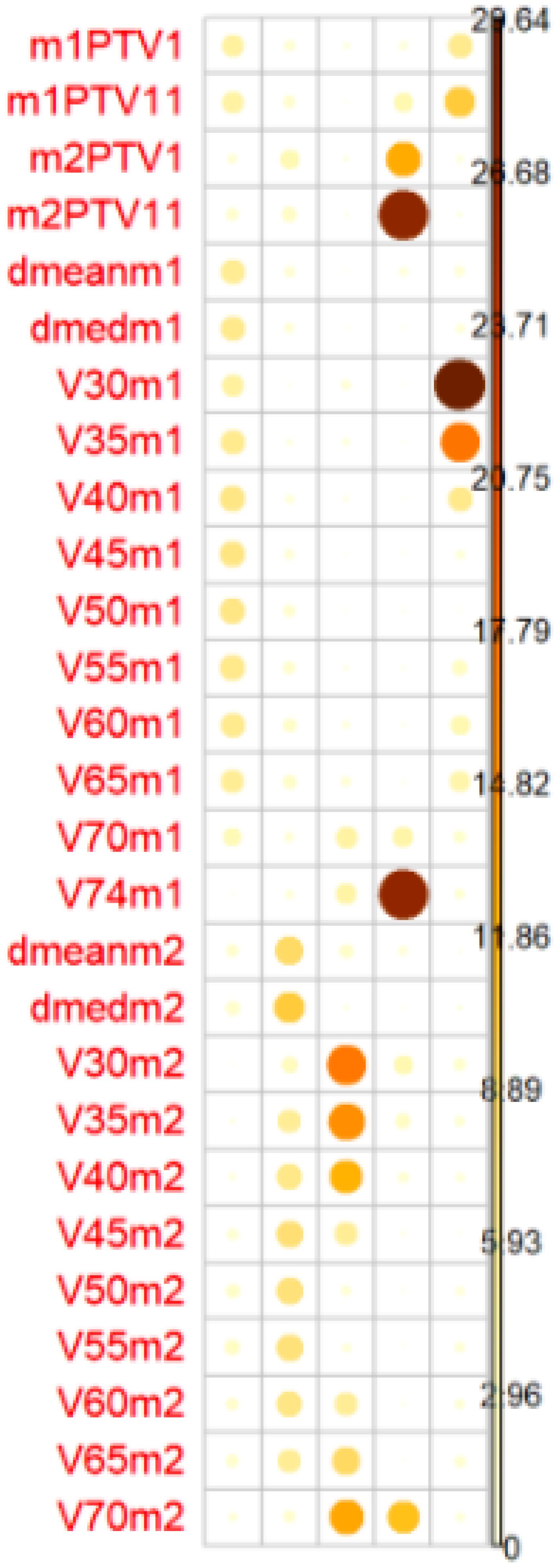 Figure 2. The balls colors determines the representation of the factors in the PC (principal components). PC1 represents dosimetrics factors of oral mucosa Mucosa 1 and PC2 dosimetrics factor of pharyngeal mucosa. Mucosa 2PTV1(54,12 Gy), PTV2 (PTV11 60 Gy), PTV3 (PTV111 66/69,96 Gy).