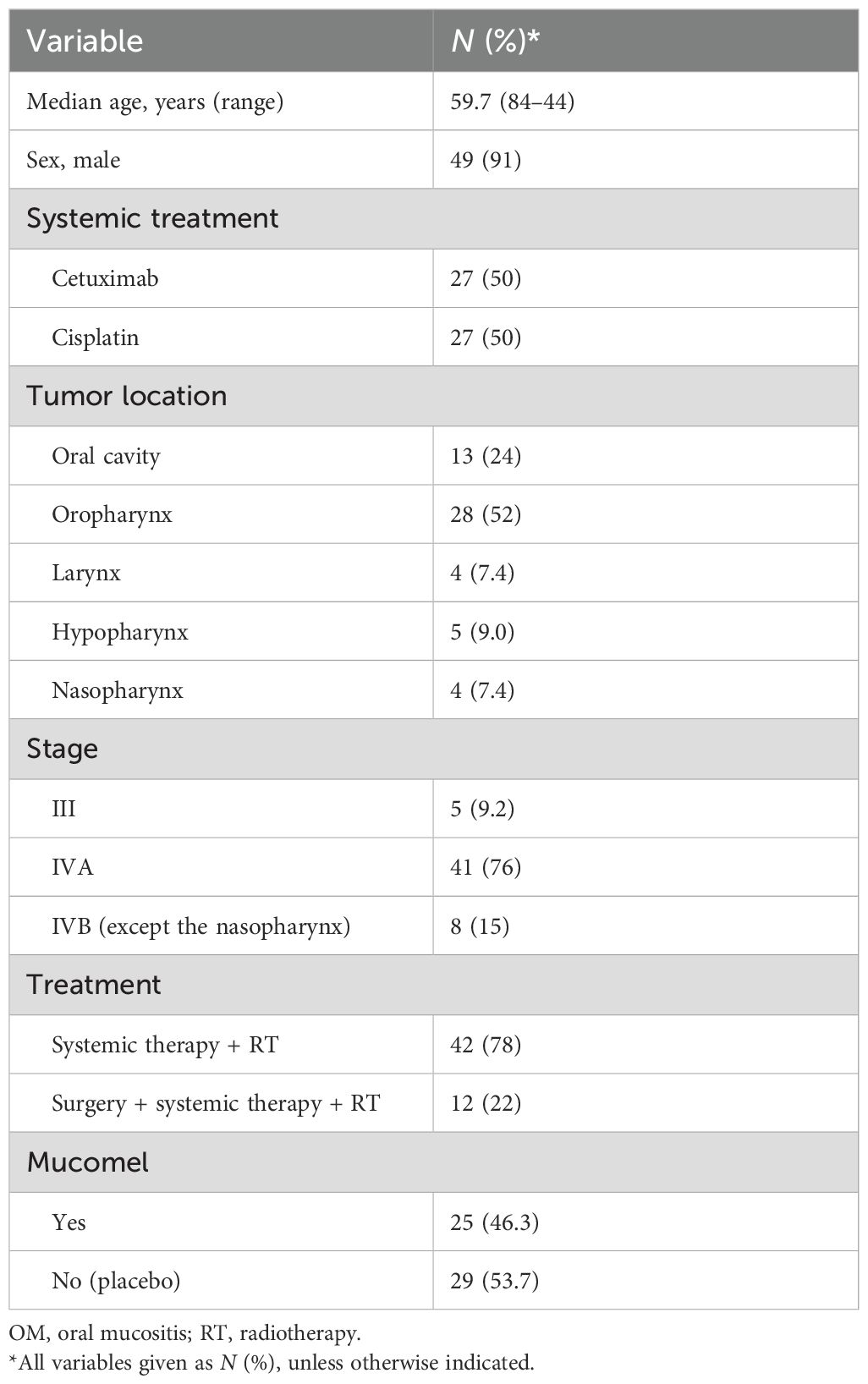 The clinical and demographic characteristics of the study population are presented in Table 1. The mean patient age was 59.7 years (range: 49–86). Among the 54 patients, 27 (50%) received cisplatin, and 27 (50%) received cetuximab. Twenty-five patients (46.3%) were treated with Mucomel®, while 29 (53.7%) received placebo.