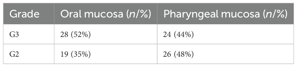 In the case of pharyngeal wall mucositis, the incidence of G3 observed in our study (44%) was lower than the incidence reported by Bhide et al. (16) (61%–87%) in their retrospective study based on the data from two dose escalation trials. By contrast, Mazzola et al. reported a substantially lower incidence rate (18%) (18).