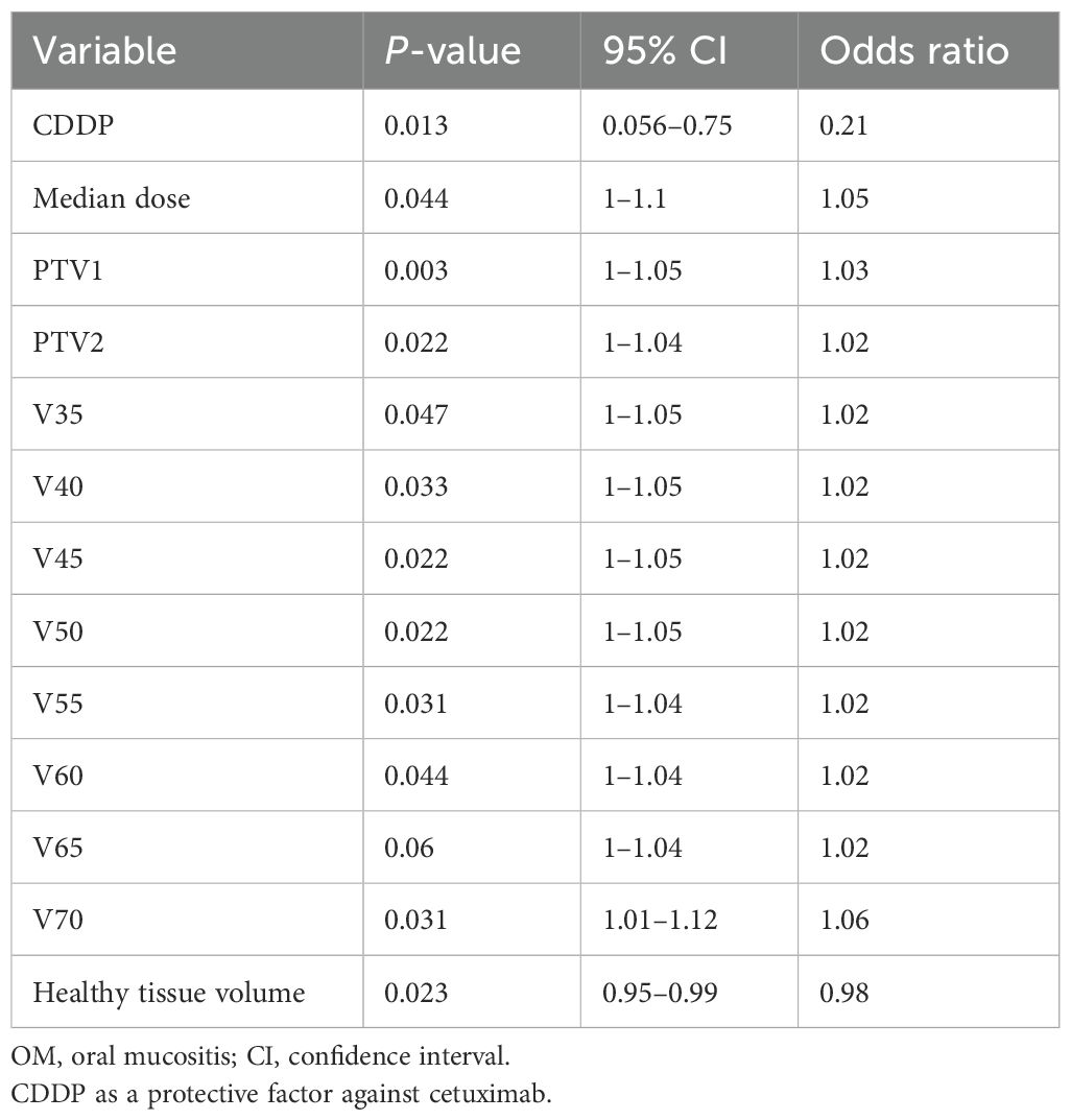 In terms of dosimetric factors according to the plan, ≥G3 OM in the oral mucosa was associated with the median dose (56 Gy) and the volume of the oral mucosa receiving low and intermediate doses. Other authors reported a similar association between the mean dose (51 Gy) and G3 OM (18, 32). By contrast, in our study, a mean dose of 54 Gy (range: 24–69.96) was not significantly associated with severe OM (OR: 1; 95% CI: 0.99–1.09).