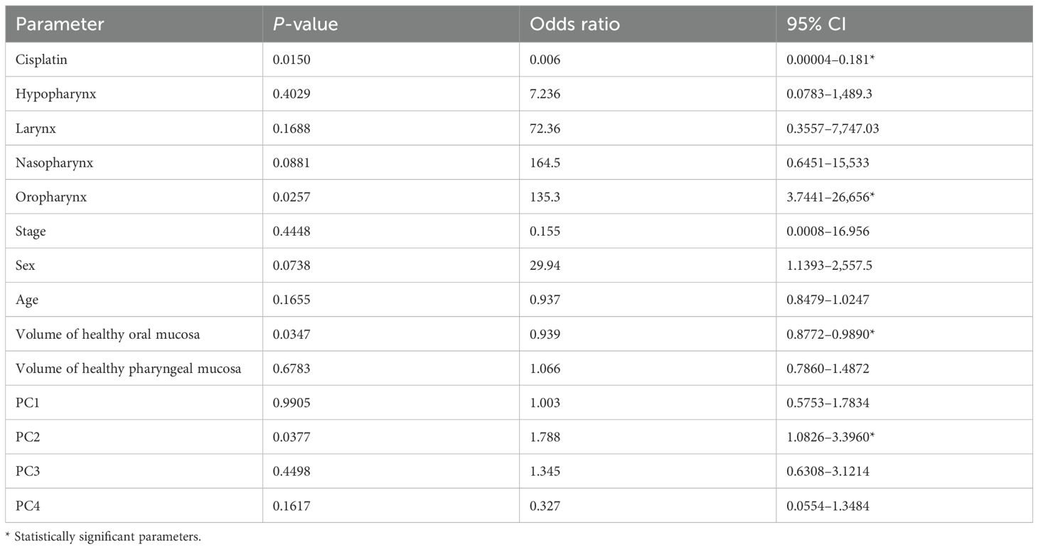 The variables were introduced and removed one by one (stepwise) on the multivariate regression analysis to ensure that they improved McFadden’s pseudo-R-squared (R2). The final multivariate regression analysis included the following variables: oral treatment (Melatonin GelR or placebo), type of systemic therapy (cisplatin or cetuximab), tumor location, stage, sex, age, treatment duration, healthy volume for the oral and pharyngeal mucosae, PC1, PC2, PC3, and PC4.
