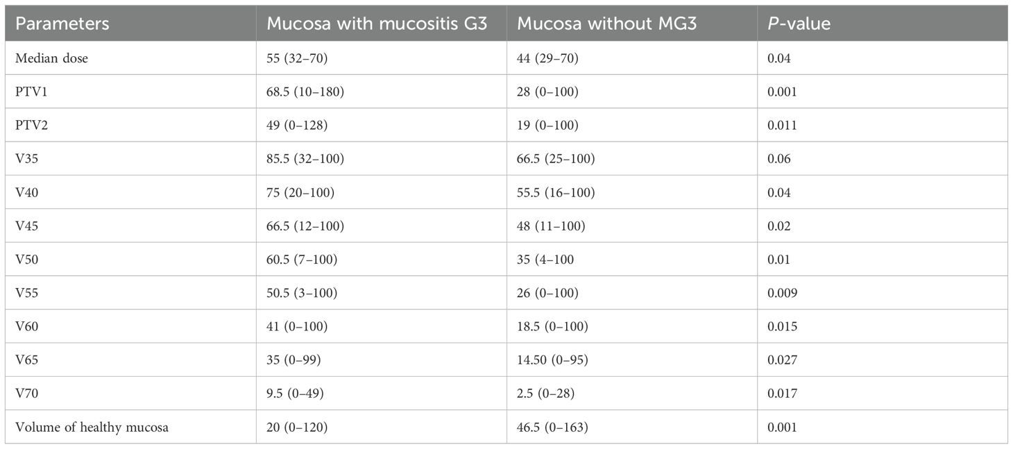 Dosimetric variables in oral mucositis G3 between patients with and without oral mucositis G3 were statistically significantly measured by the Wilcoxon rank test (Table 6).