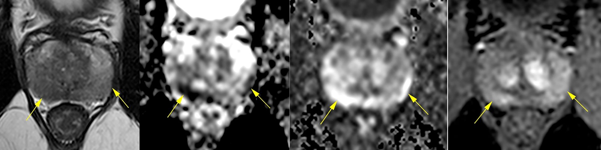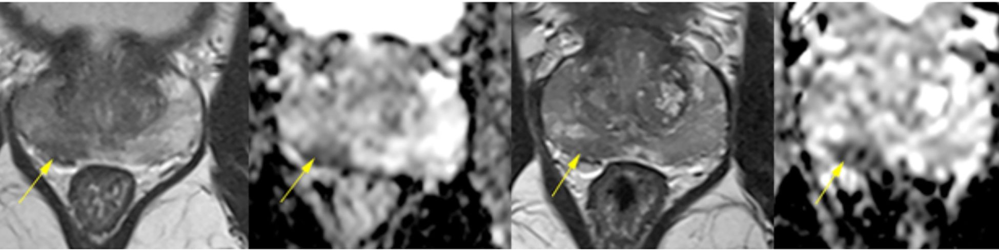 Figure 1. Multiparametric prostate MRI scans from June 22 and December 26, 2022, demonstrating diffuse and heterogeneous low signal intensity in the peripheral zone, predominantly on the right, with confluent, ill-defined elongated areas lacking discrete nodules. Both scans revealed diffuse early contrast enhancement and restricted diffusion at the right base (1.2 cm), consistent with PI-RADS 4 classification. The stability of these nonspecific findings over time, along with their bilateral distribution, suggested an underlying inflammatory or infectious process rather than malignancy.