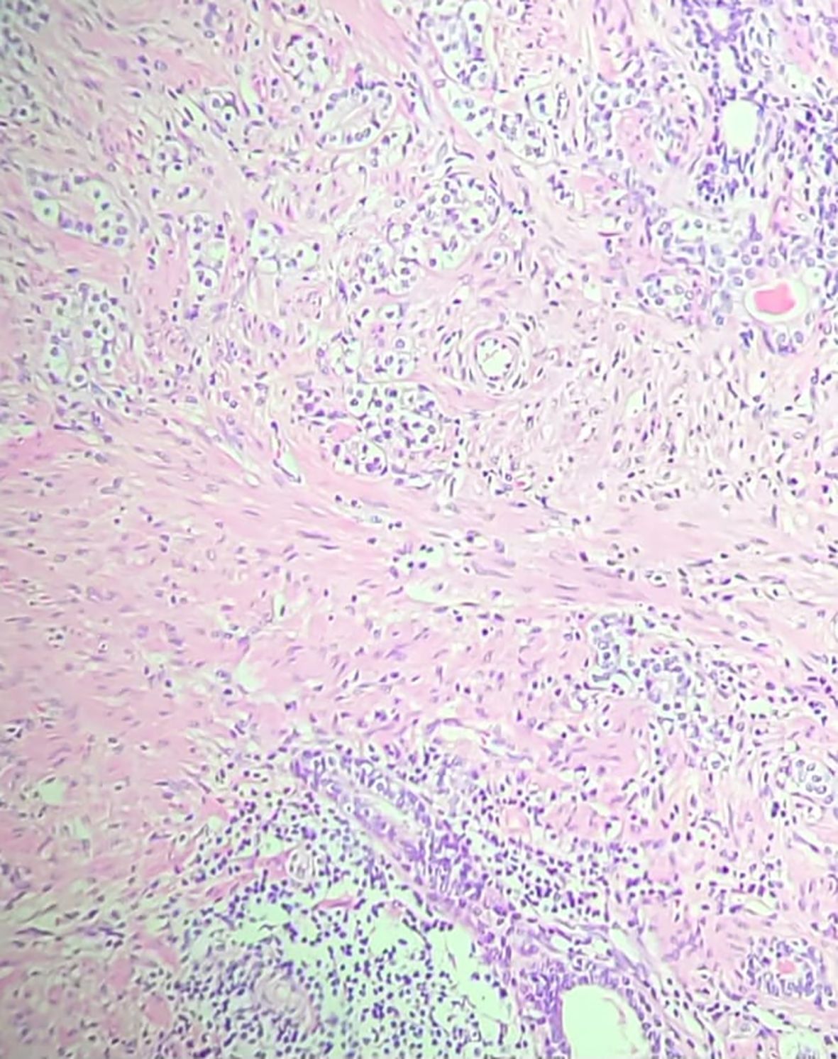 Figure 3. Hematoxylin and Eosin (H&E) stained section (20× magnification) from the radical prostatectomy specimen, demonstrating acinar adenocarcinoma with Gleason score 7 (3 + 4), ISUP grade group 2. Adjacent areas showed chronic inflammatory infiltrates consistent with prostatitis, supporting the hypothesis that COVID-19–related inflammation may have contributed to carcinogenesis in this patient.