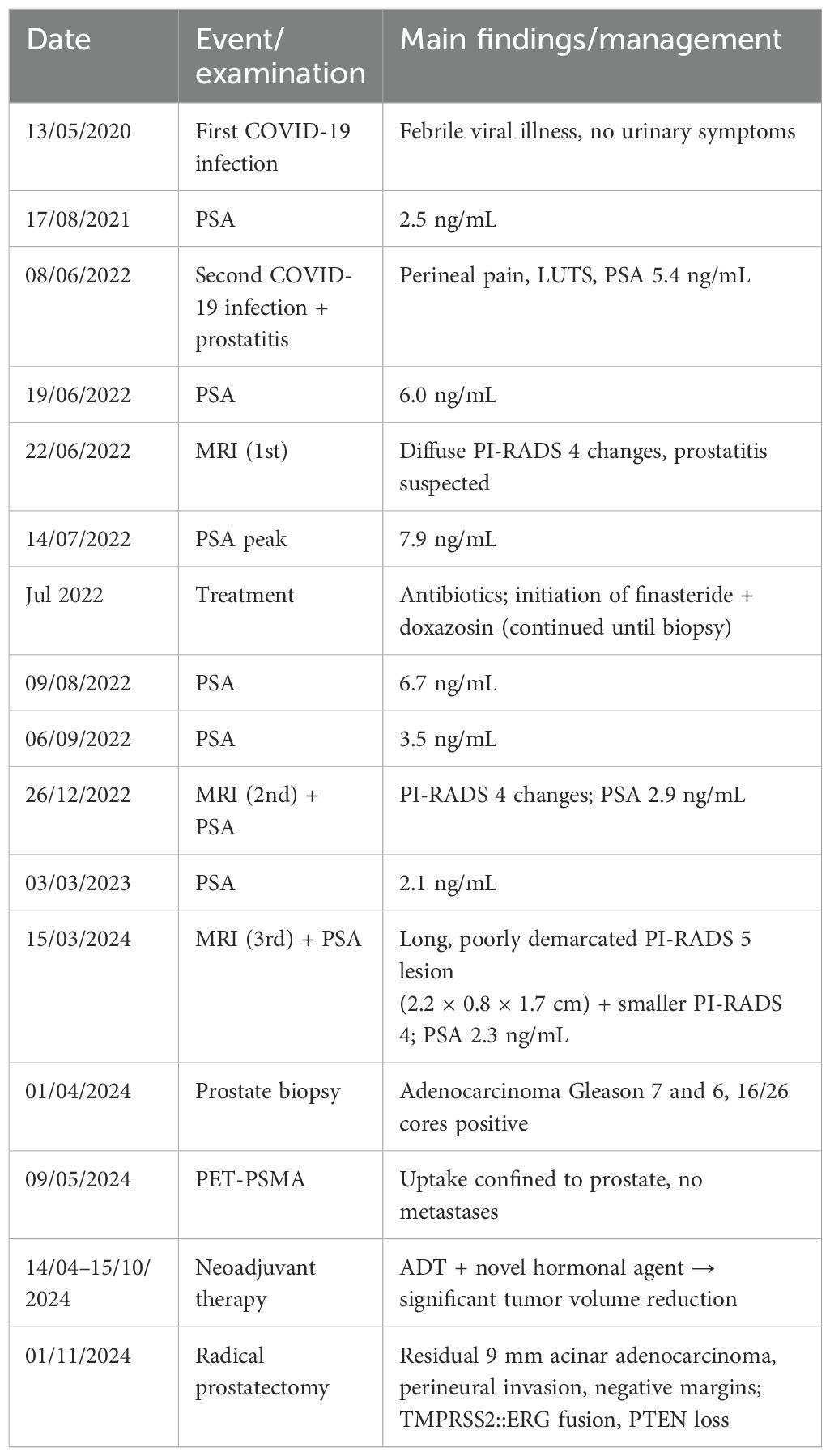 Case presentation: We describe the case of a 55-year-old male with no family history of prostate or breast cancer and no germline pathogenic variants on next-generation sequencing (NGS), who developed lower urinary tract symptoms (LUTS) and PSA elevation shortly after a second COVID-19 infection. Multiparametric MRI initially demonstrated diffuse PI-RADS 4 changes compatible with prostatitis. Although symptoms improved with antibiotics, LUTS persisted and were managed with finasteride and doxazosin. Over the following two years, serial imaging revealed progression to a long, poorly demarcated PI-RADS 5 lesion extending from apex to base in the right posterior peripheral zone, and a smaller PI-RADS 4 lesion on the left. Targeted biopsy confirmed acinar adenocarcinoma (Gleason 7 and 6 in 16 of 26 cores). PET-PSMA showed disease confined to the prostate. The patient underwent neoadjuvant therapy with androgen deprivation therapy (ADT) plus a novel hormonal agent (NHA) from April 14 to October 15, 2024, resulting in significant tumor reduction. Radical prostatectomy on November 1, 2024 revealed a small residual acinar adenocarcinoma focus with perineural invasion, negative surgical margins, and molecular evidence of TMPRSS2::ERG gene fusion and PTEN loss.