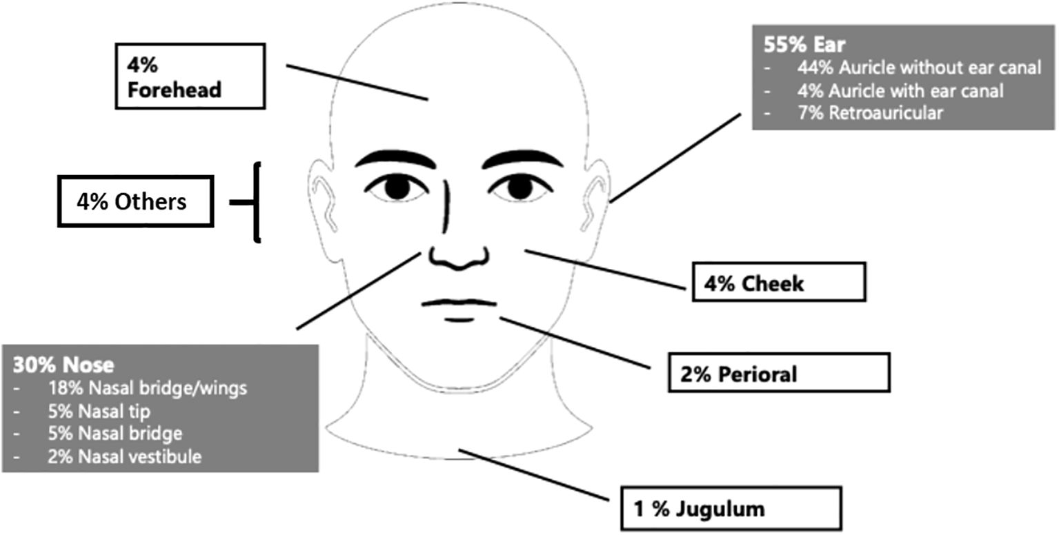 14. Mulvaney PM, Higgins HW 2nd, Dufresne RG Jr, Cruz AP, and Lee KC. Basal cell carcinomas of the ear are more aggressive than on other head and neck locations. J Am Acad Dermatol. (2014) 70:924–6. doi: 10.1016/j.jaad.2013.12.021
