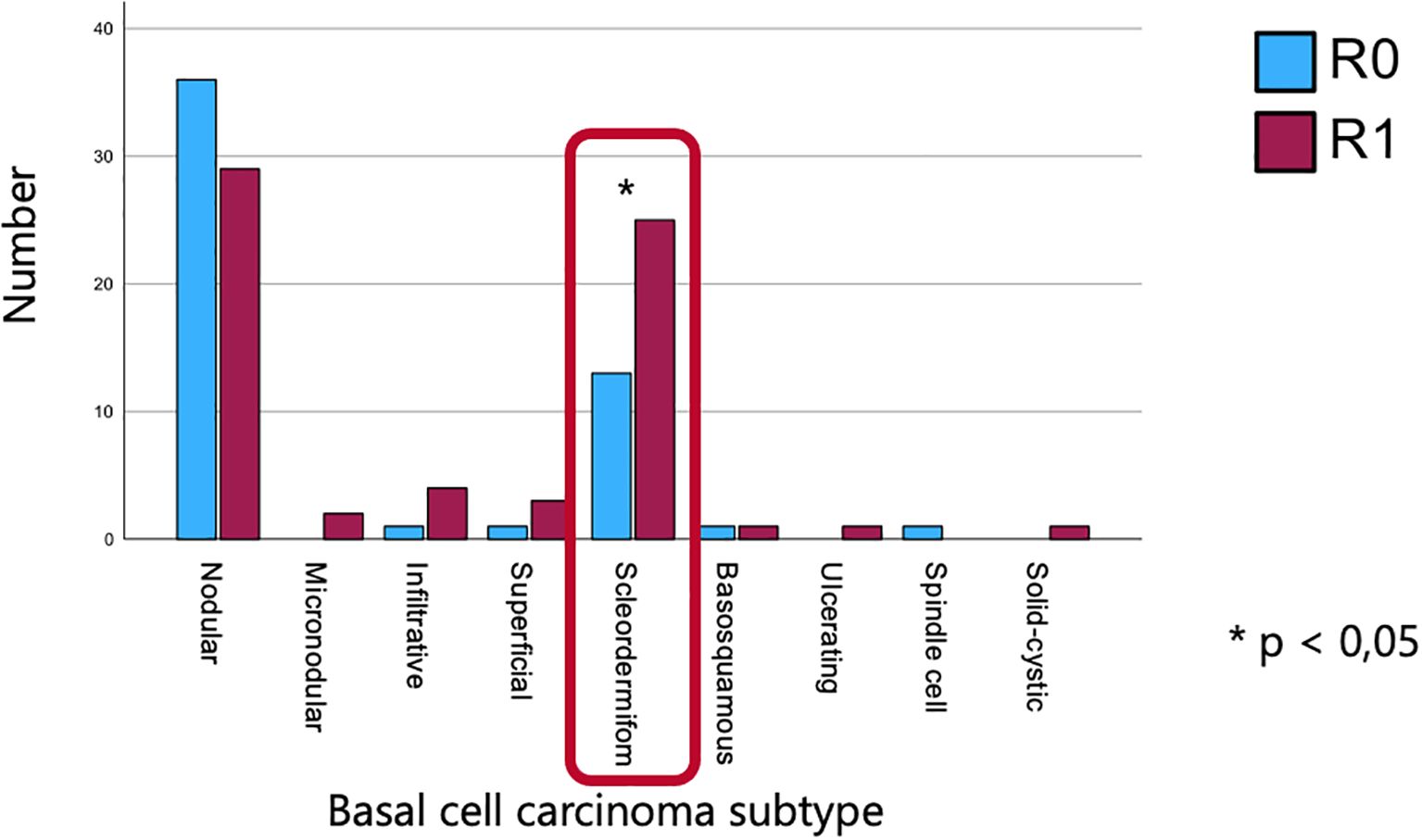 What histological and clinical parameters are associated with an R1 resection status and recurrence rate in BCC? How does an R1 resection status influence the likelihood of tumor recurrence? Answering these questions is crucial for optimizing treatment strategies in the challenging balance between achieving functionally and aesthetically satisfactory outcomes and maintaining oncological safety, particularly in high-risk patients requiring complex reconstructions.