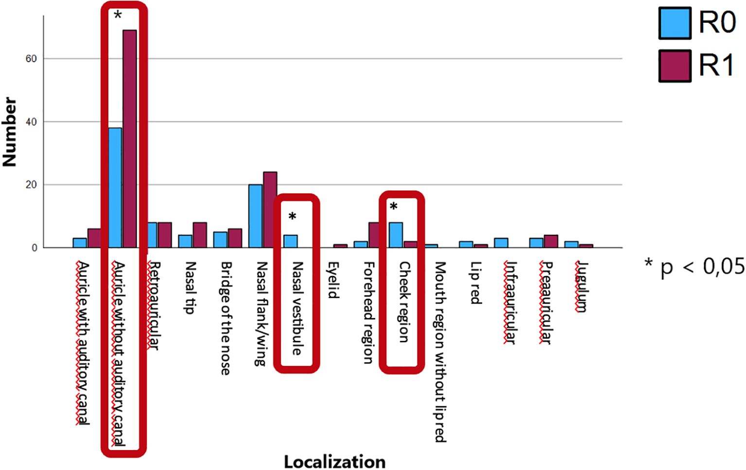 Figure 5. Anatomical localization and its association with R1 resection status, with lesions on the auricle (excluding the external auditory canal) showing a significantly higher rate of incomplete resections and lesions on the nasal vestibule and the cheek region showing a significantly higher rate of complete resections.
